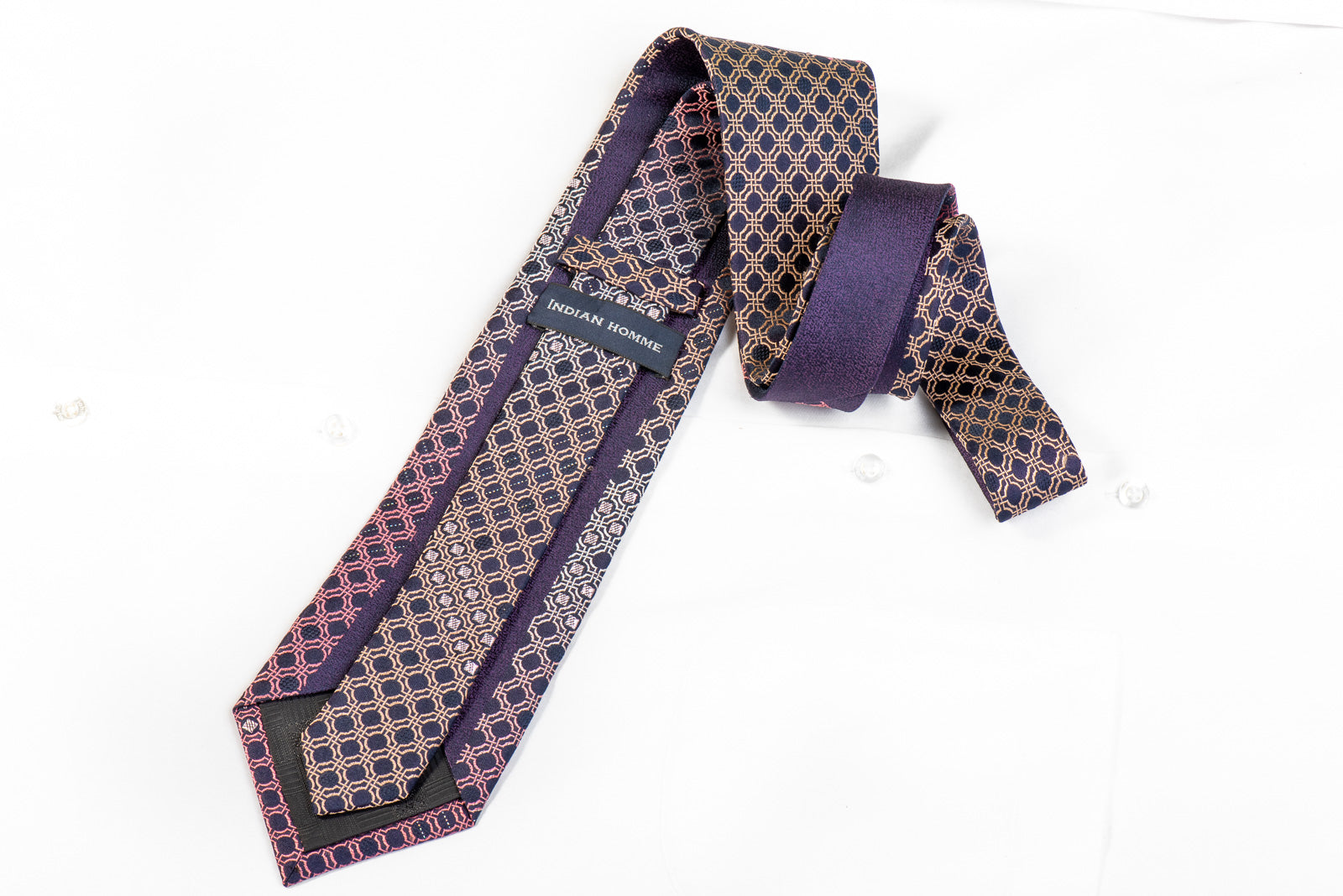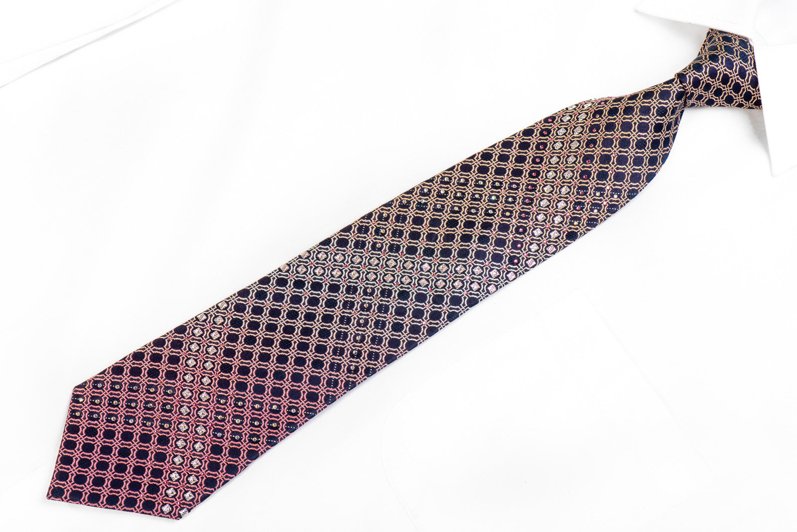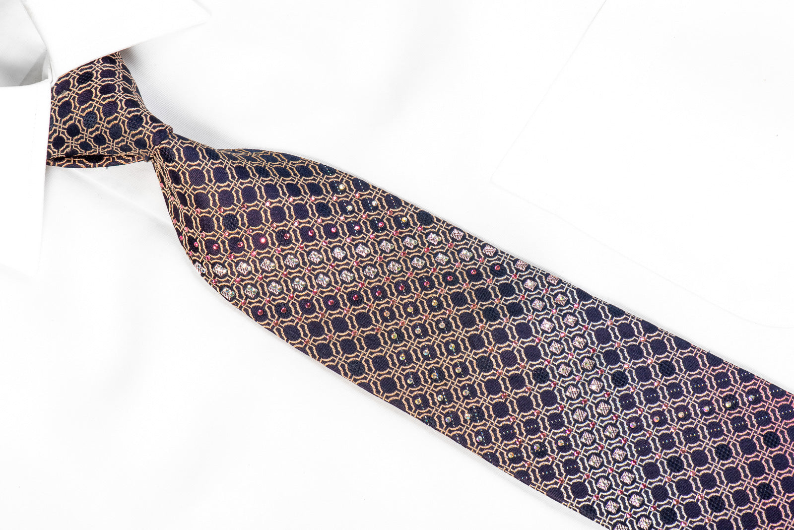 This is a stylish Rhinestone tie handmade from the finest quality silk and designed by top brand name Indian Homme. Presenting an elegant woven purple Geometric design on navy blue, sparkling with crystal rhinestones and metallic silver sparkles.