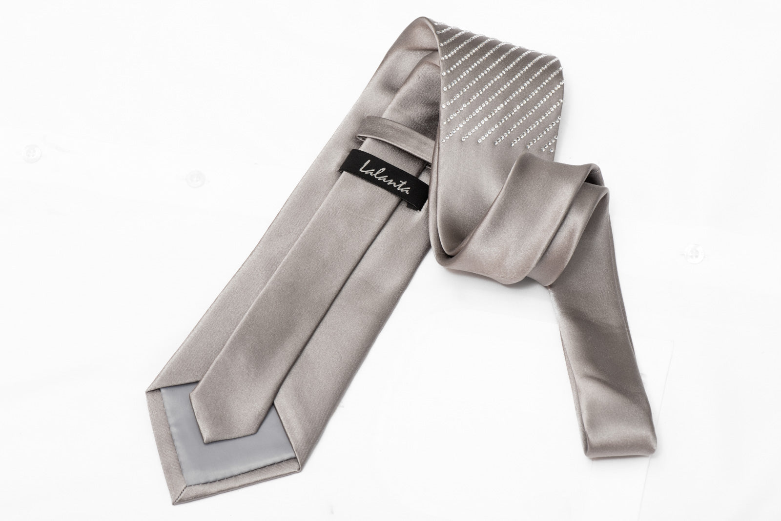 Elevate formal elegance with this exquisite silver silk necktie from Lalanta, a masterpiece of craftsmanship and refined detailing. Meticulously adorned with over 2,000 sparkling rhinestones arranged in diagonal stripes, this tie transforms classic menswear into a statement of modern luxury.