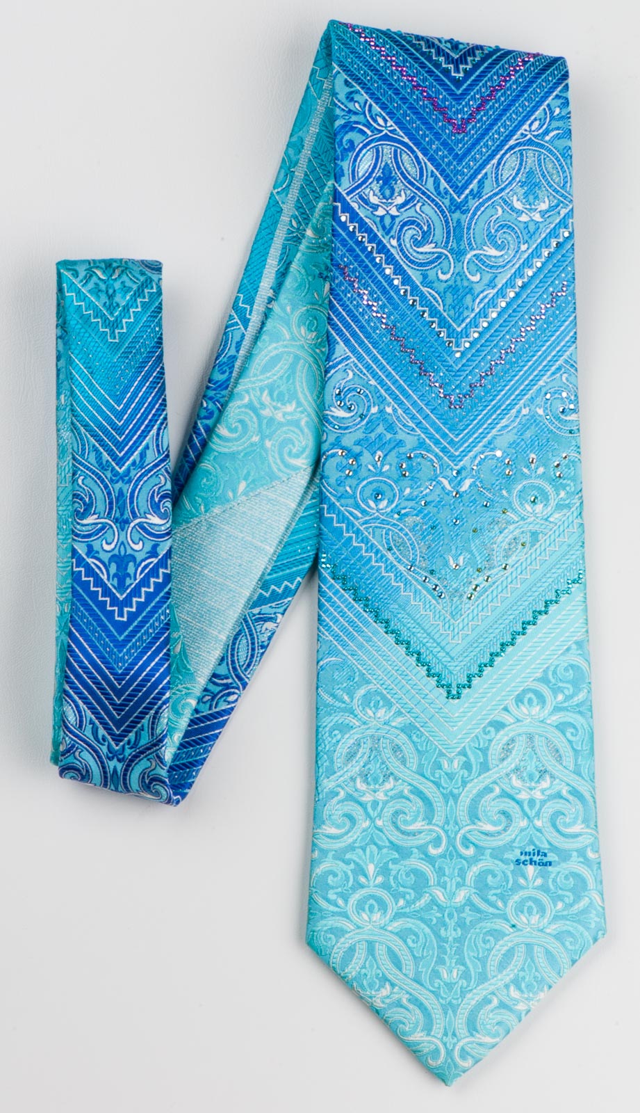Gorgeous men's hand made silk Neck Tie designed by brand name Mila Schon presenting a wonderful woven damask design on blue with V Stripes, perfectly complemented with clear white and blue Rhinestones and metallic silver studs.