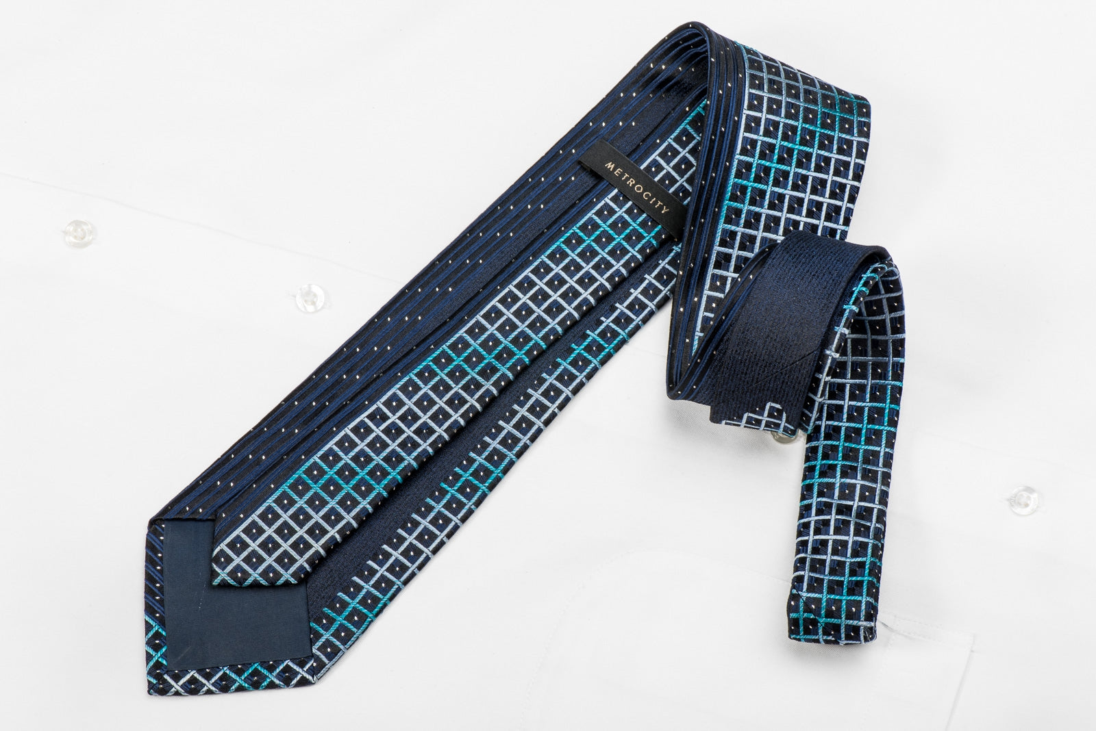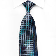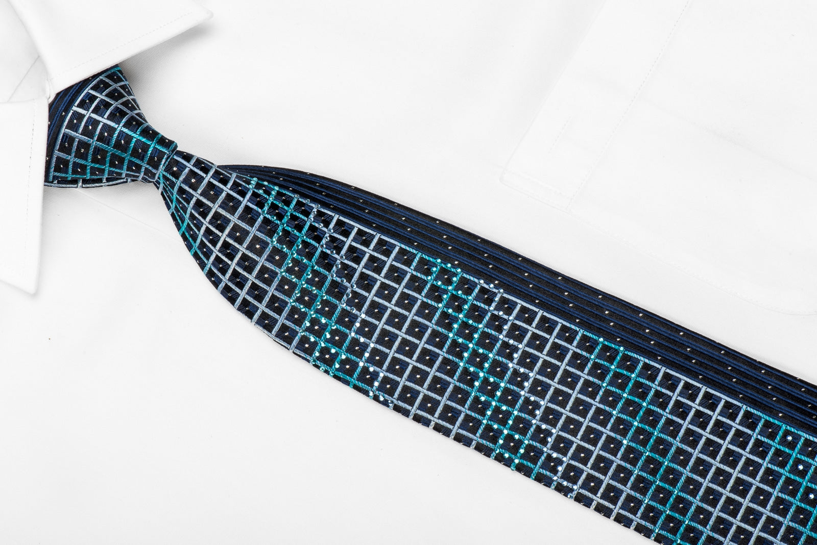 Stylish men's silk crystal necktie perfect for every occasion handmade and designed by top brand name Metro City. Presenting an elegant woven blue Trellis design on black, sparking with clear blue crystal Rhinestones and metallic silver sparkles.