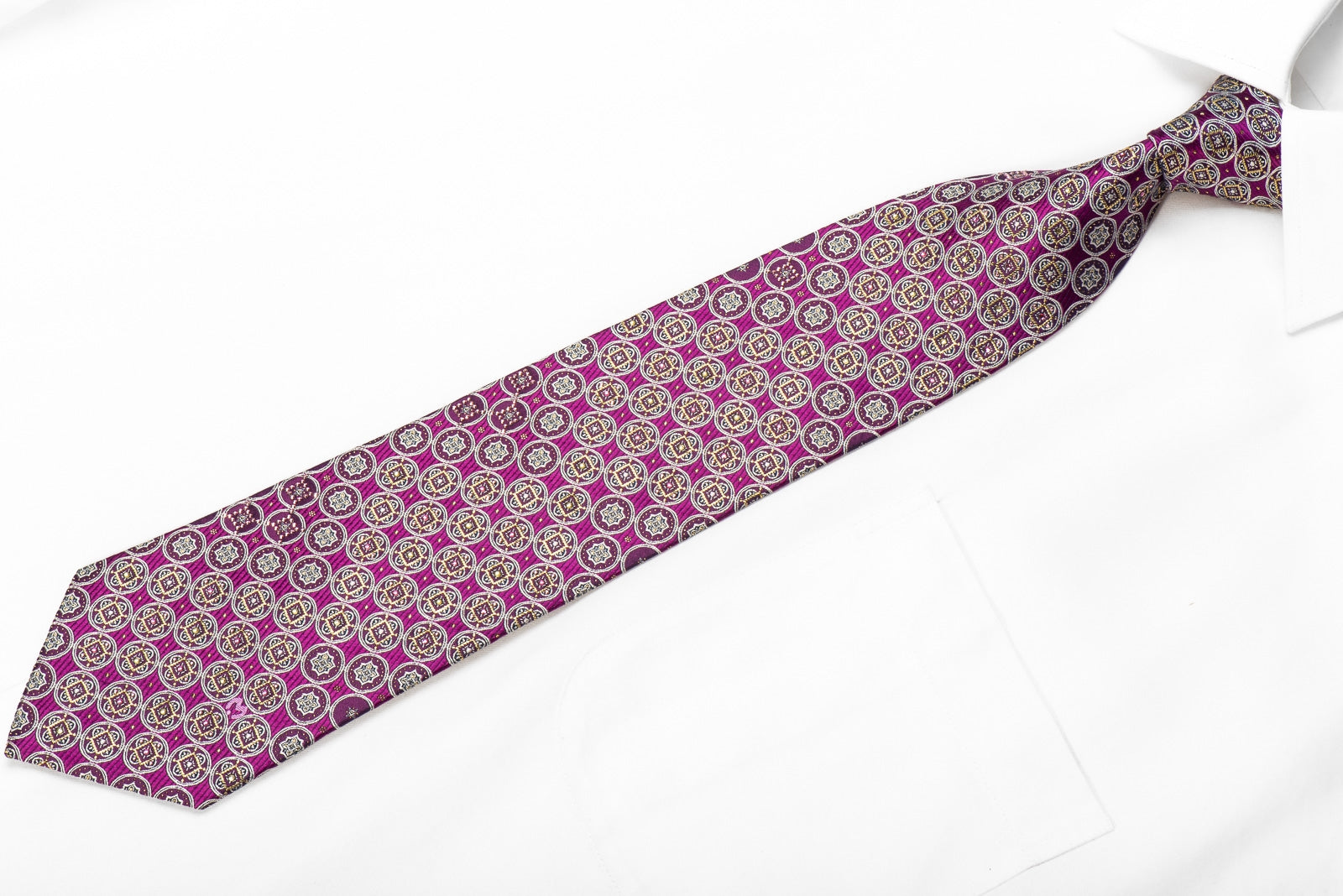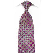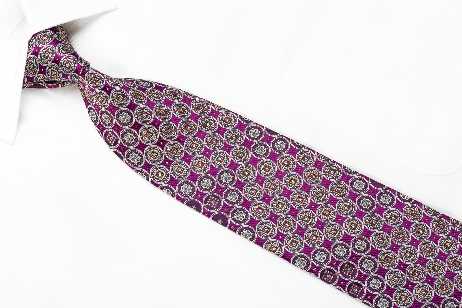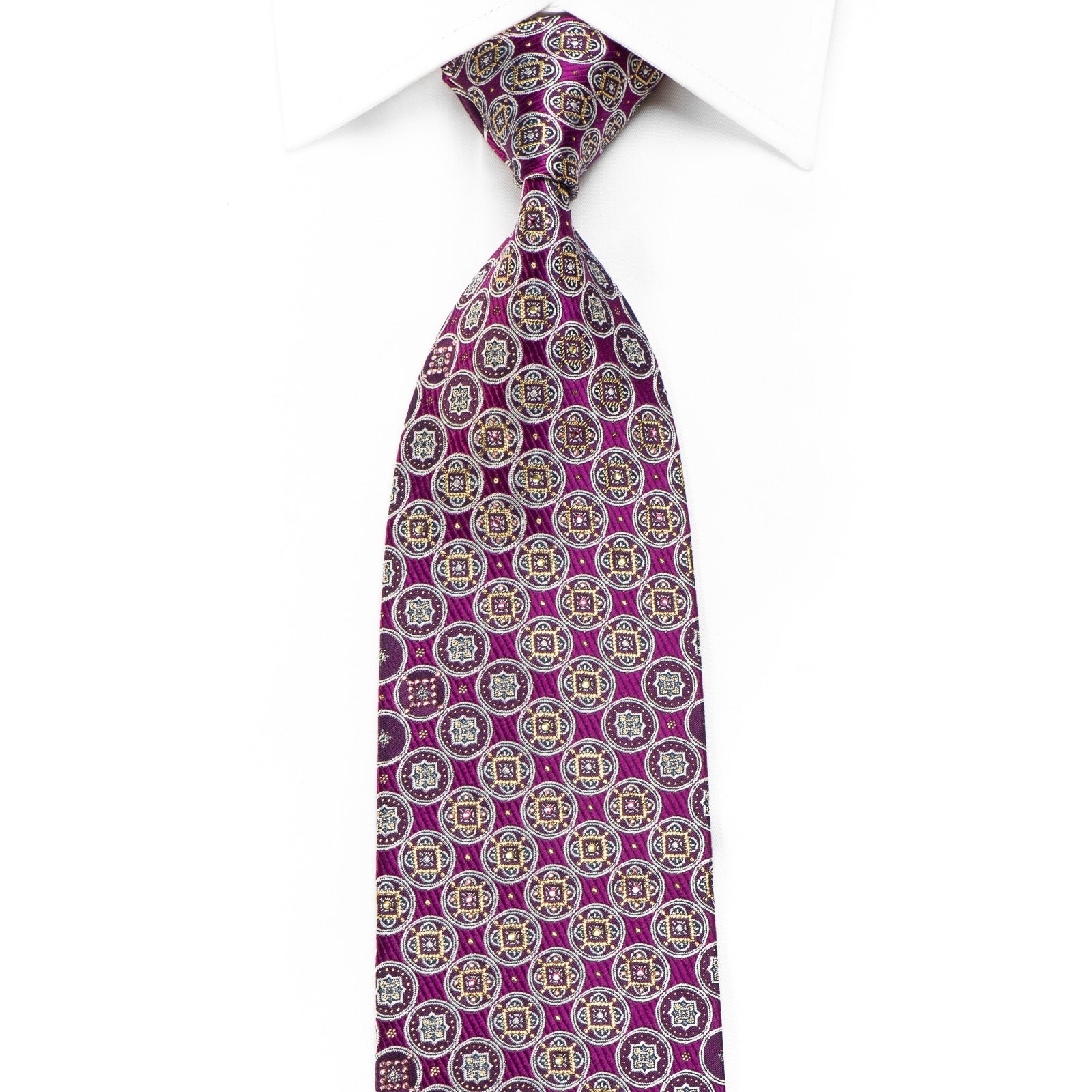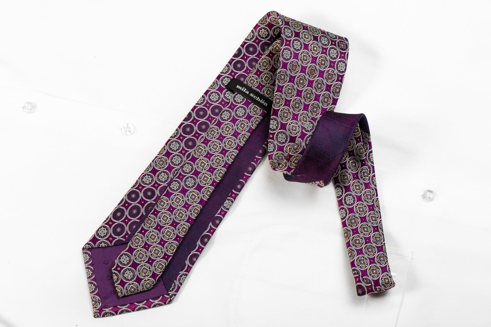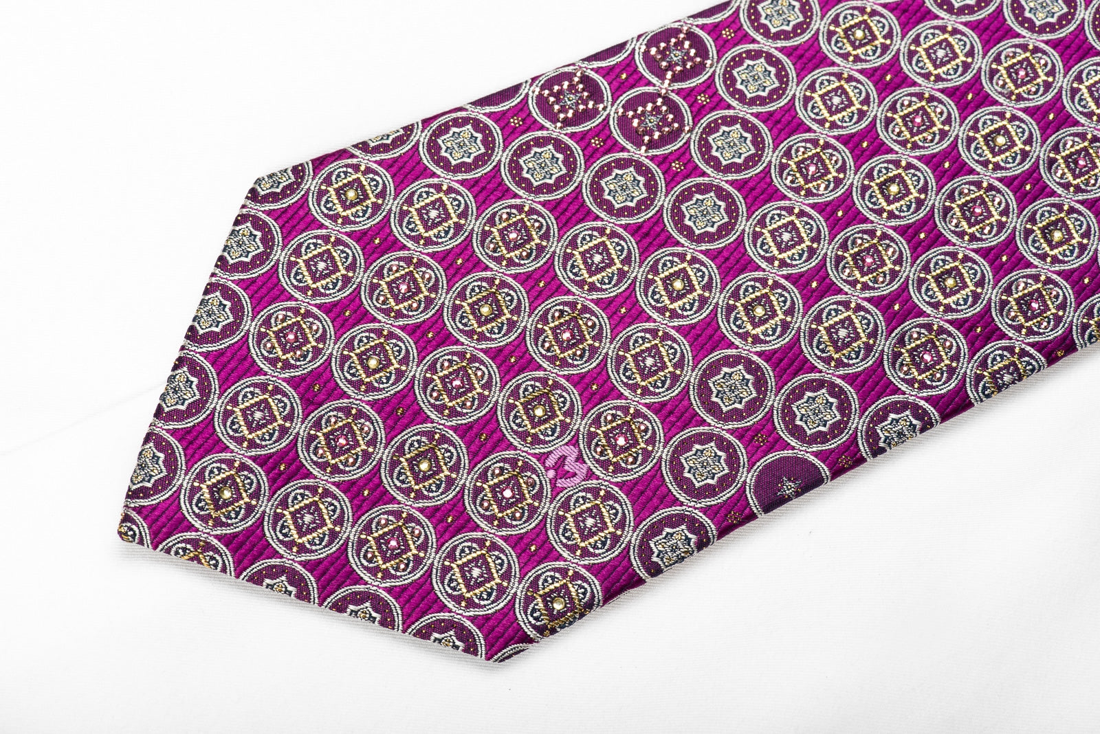 Stylish men's crystal necktie perfect for every occasion handmade from the finest quality silk and designed by top brand name Mila Schon. Presenting an elegant woven silver, gold Medallions design on purple, sparkling with clear white, purple crystal Rhinestones, purple Studs and metallic gold sparkles.