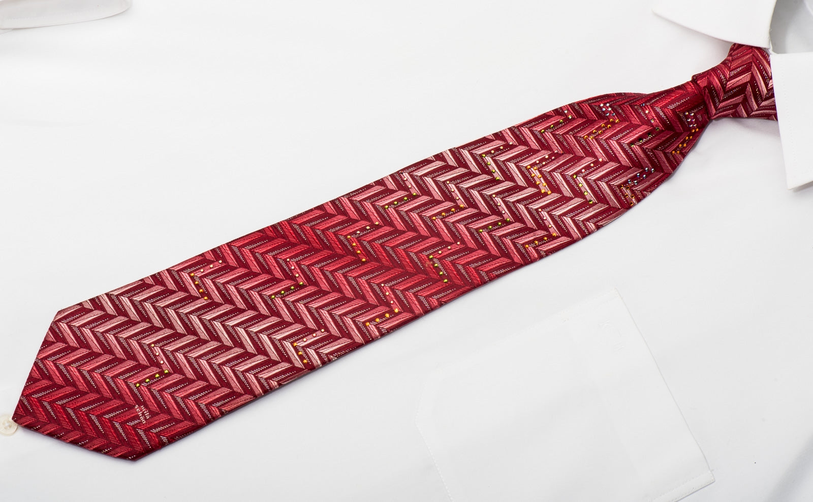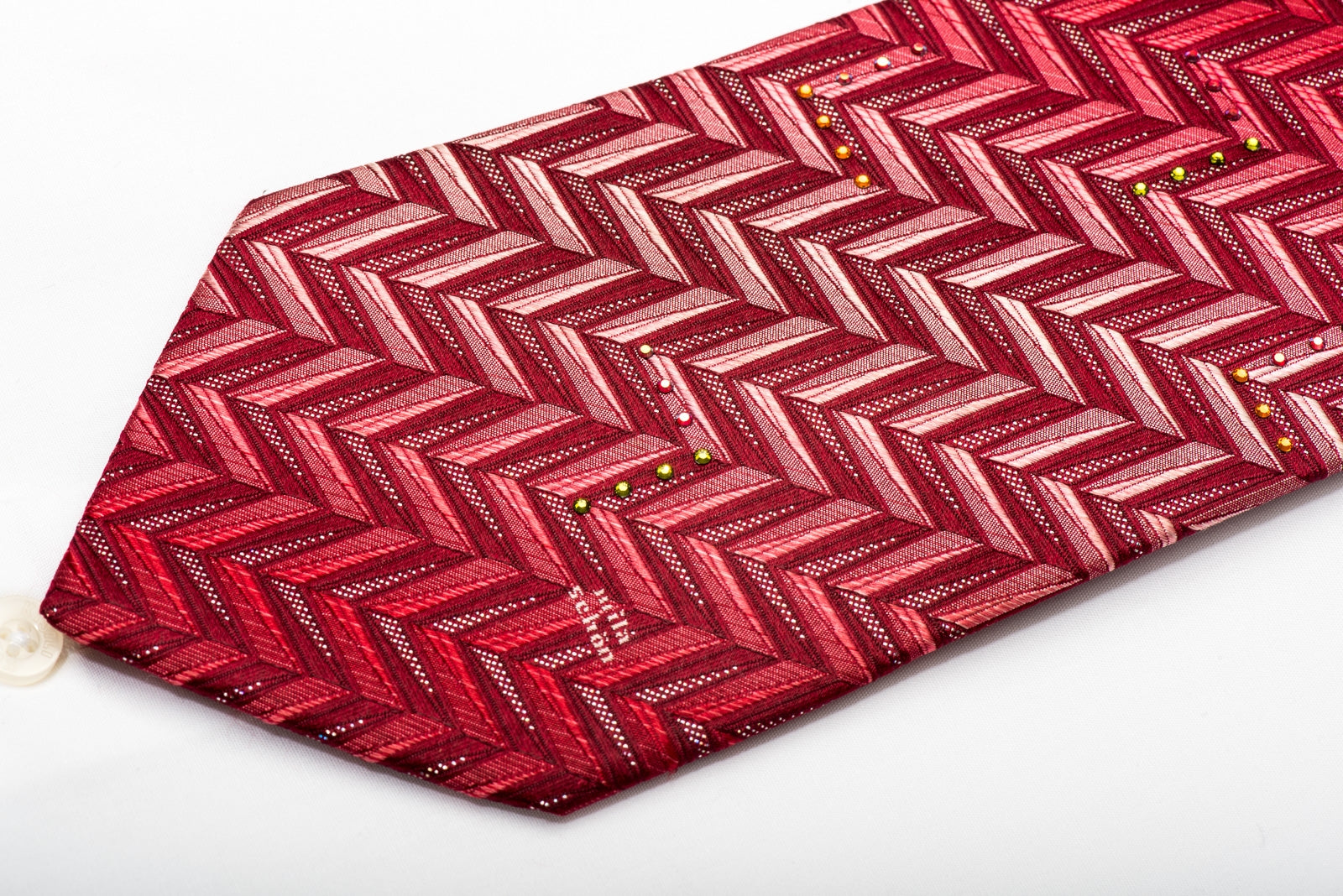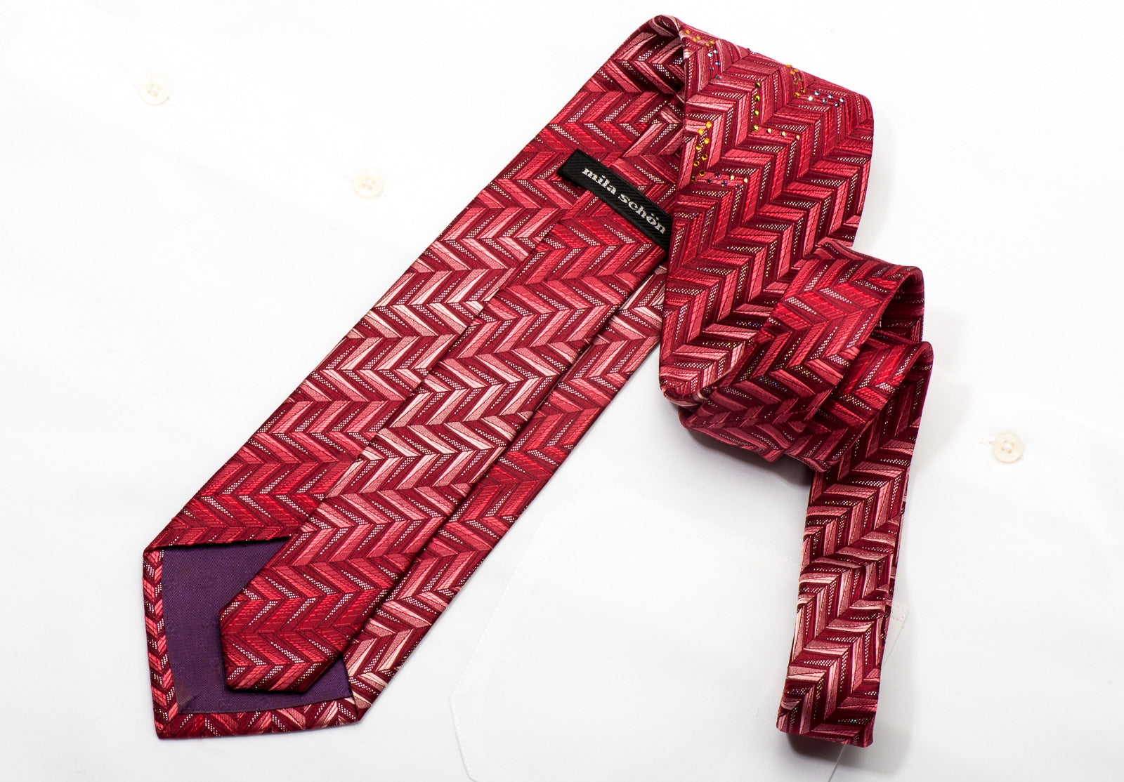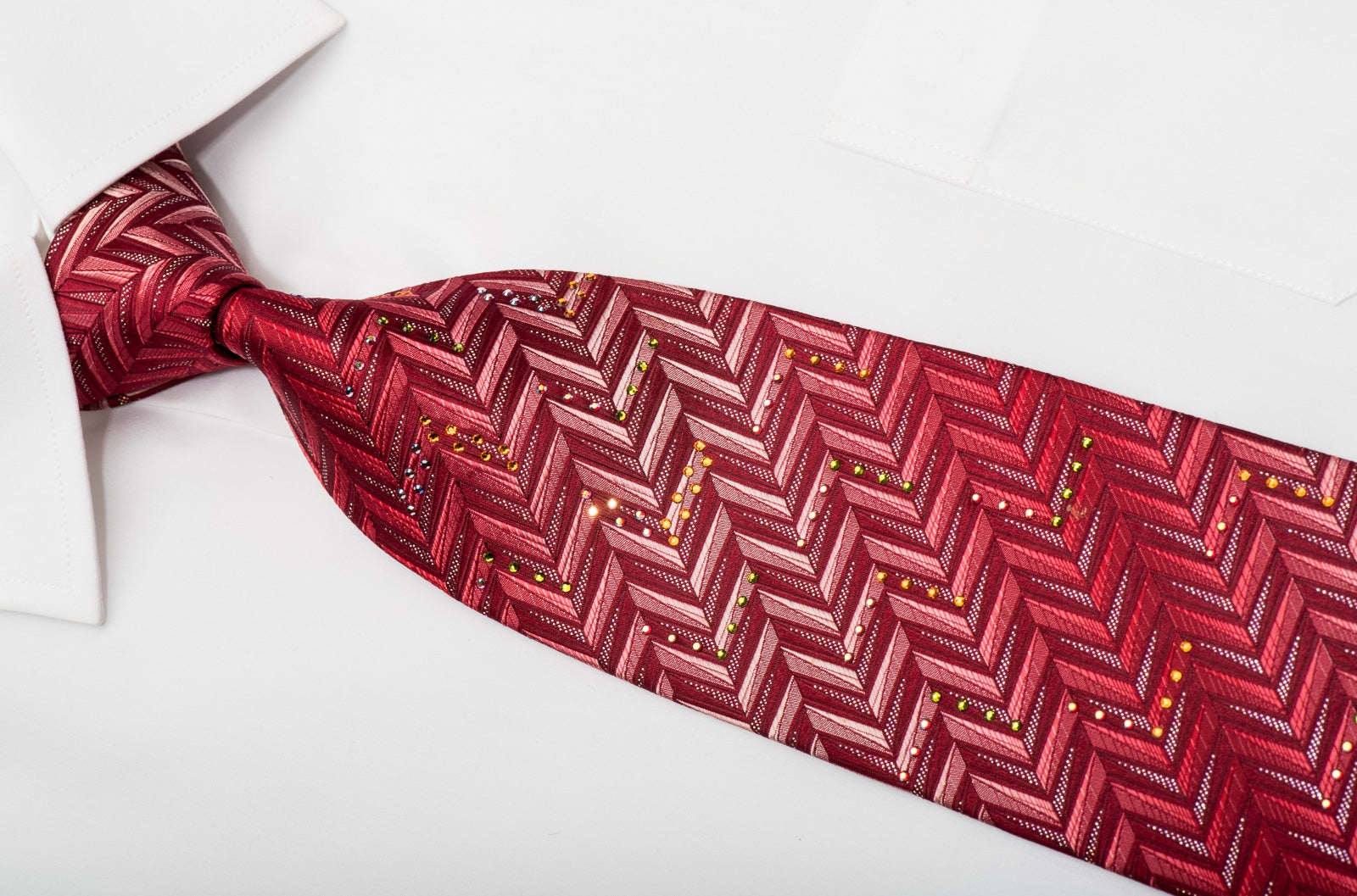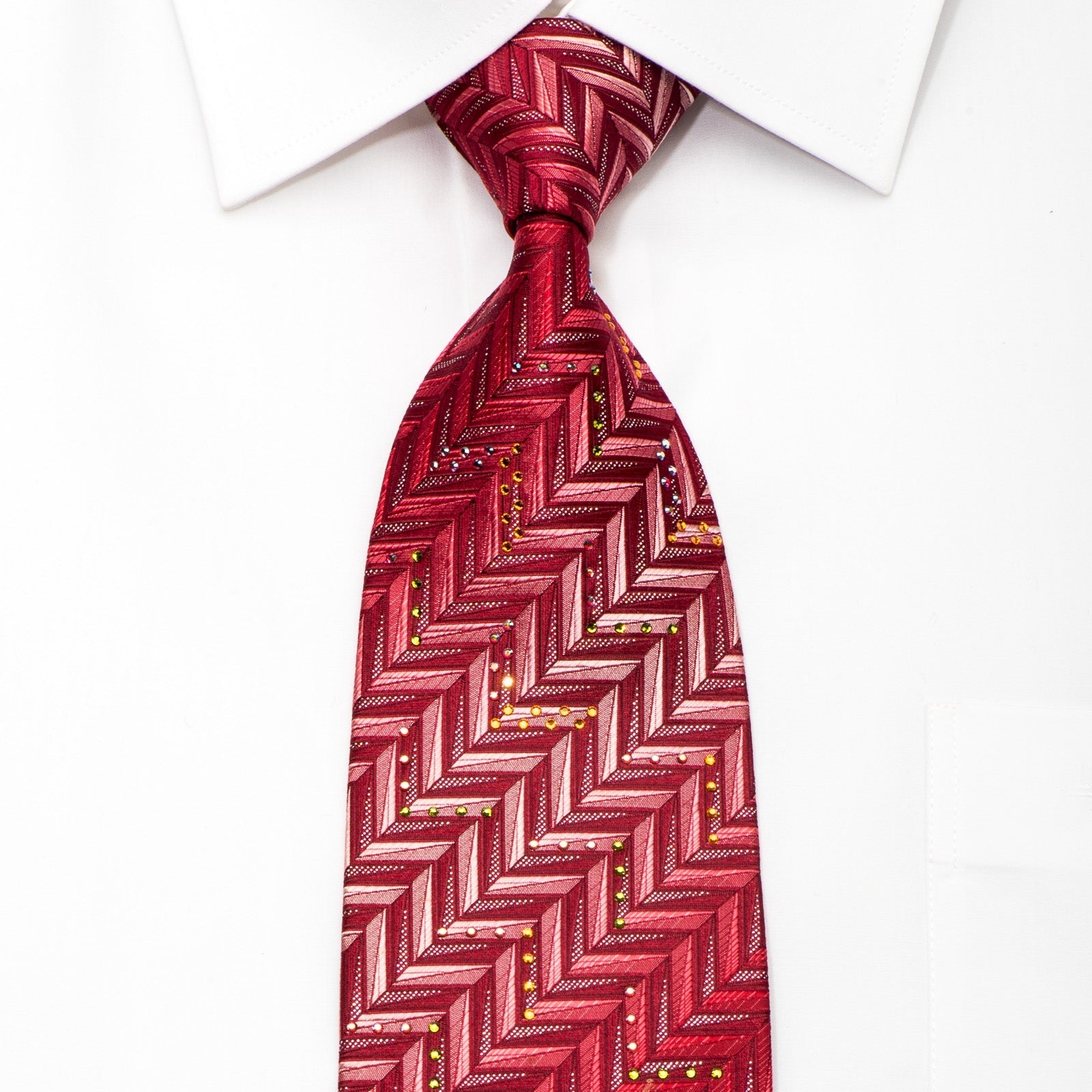 Stylish men's silk necktie perfect for every occasion handmade from the finest quality silk and designed by top brand name Mila Schon. Presenting an elegant Herringbone design on red woven silk, sparkling with crystal Rhinestone and silver sparkles.