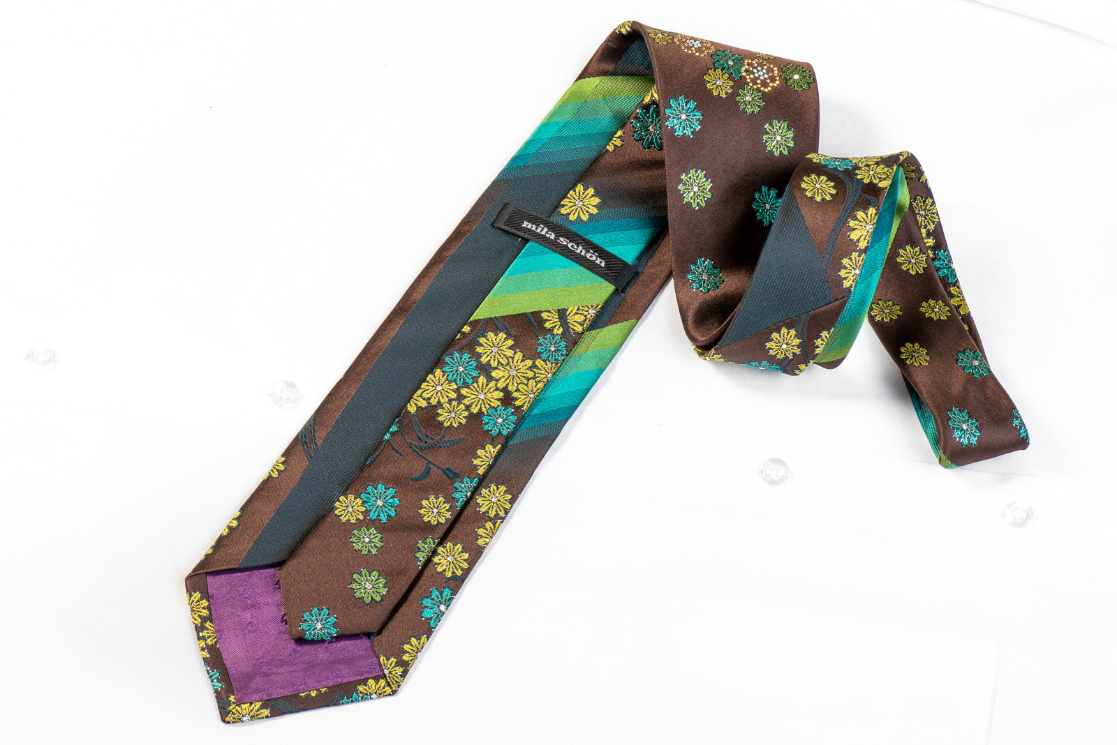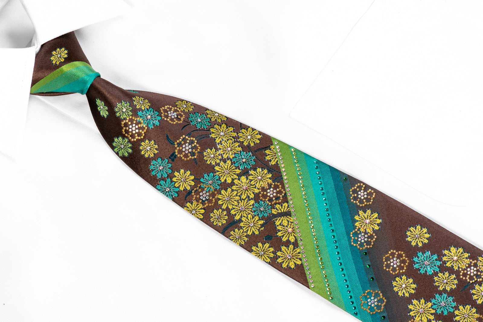 This is a beautiful men's Rhinestone necktie perfect for every occasion handmade from the finest quality silk and designed by top brand name Mila Schon. Presenting an elegant woven green, turquoise Floral and Striped design on brown. Sparkling with Crystal AB Rhinestones and embellished with metallic silver sparkles.