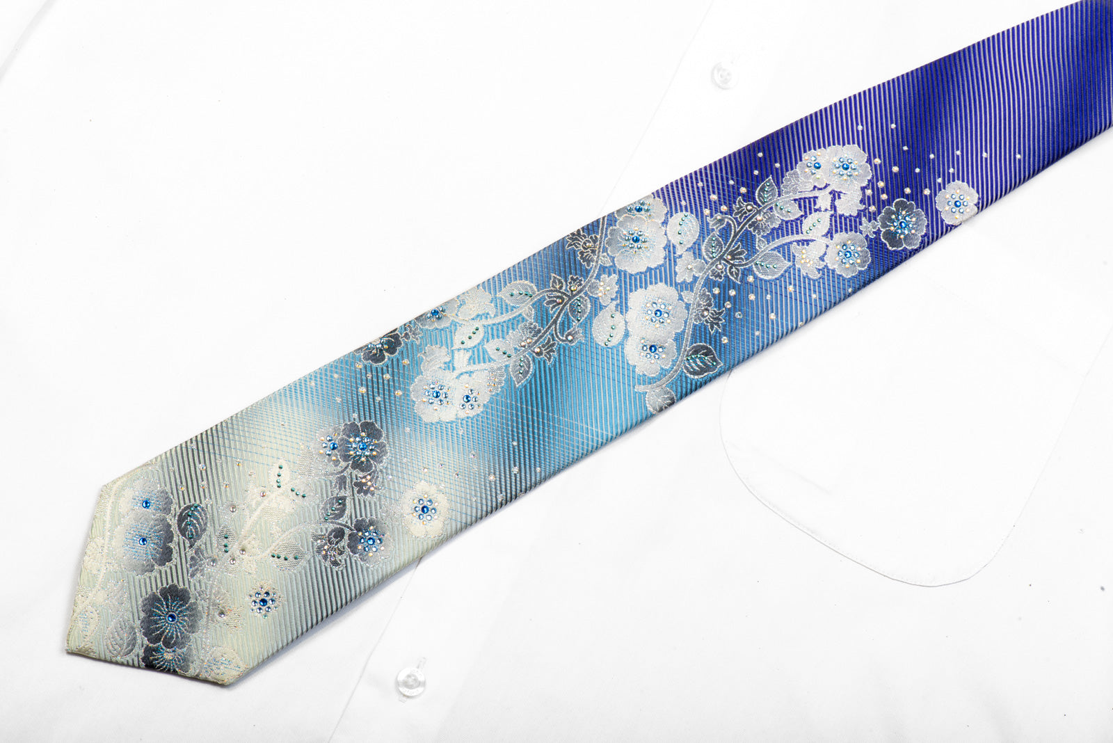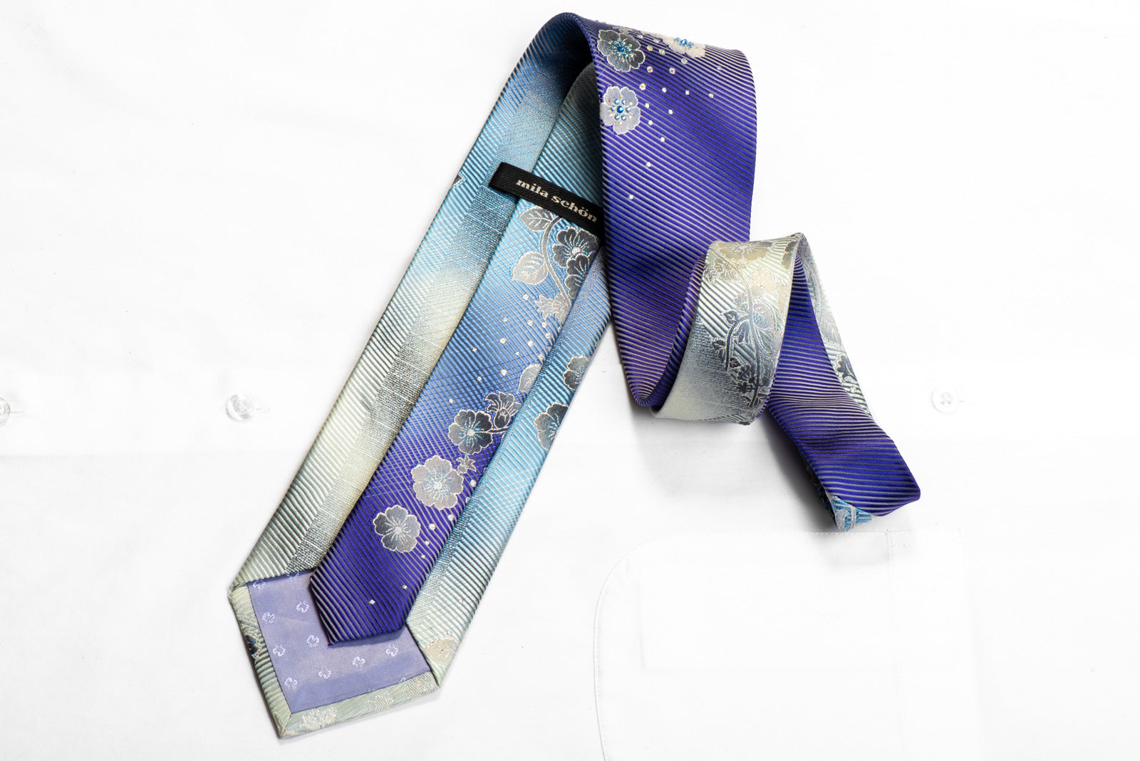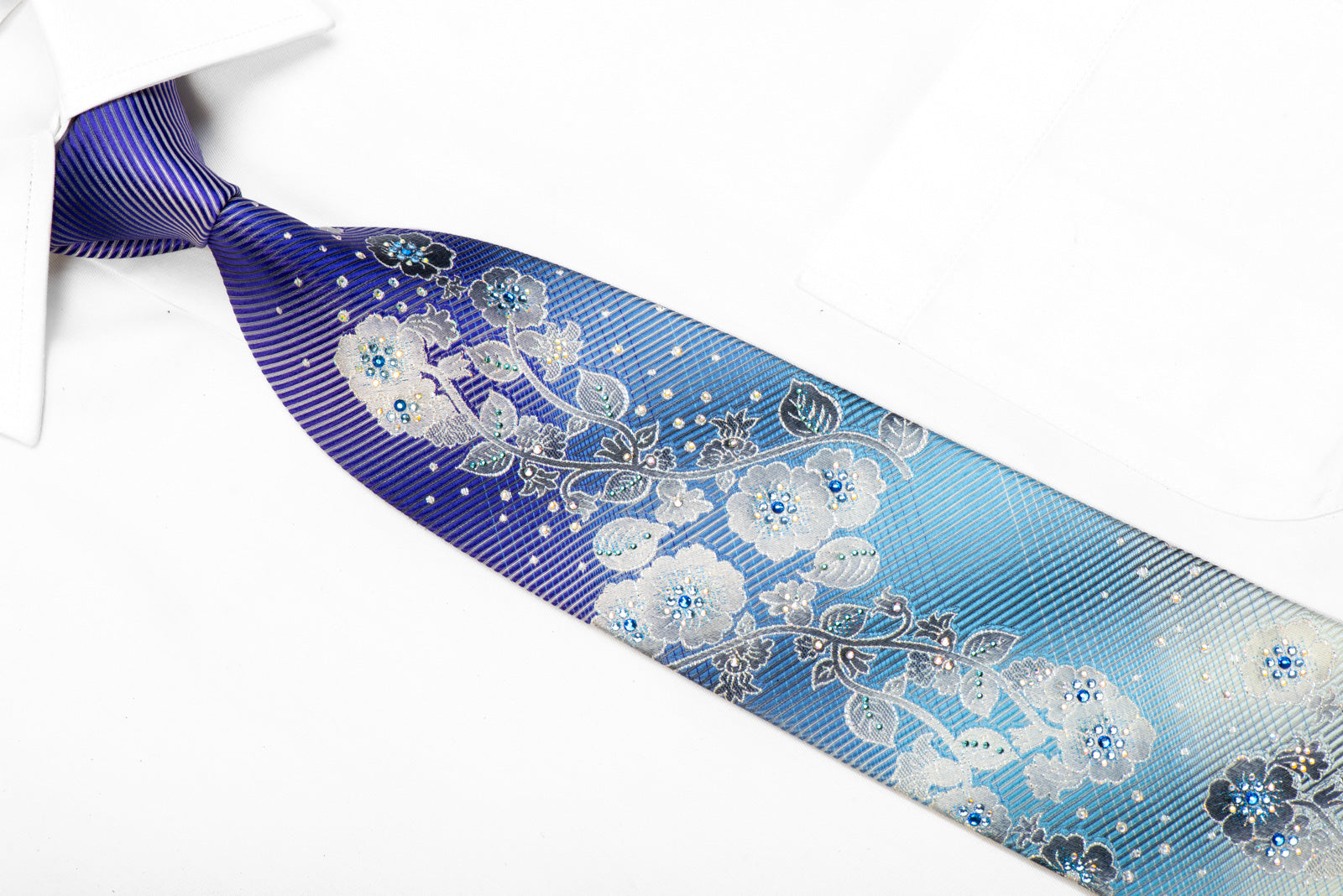 Material - SilkDesign - FloralColor - Blue, Purple, SilverLength - Classic (57 in.-60 in.)(145 cm-153 cm)Width - Classic (3 1/4 in.-3 3/4 in.)(8 cm-9.5 cm)Special Features - Blue Rhinestones, Crystal Ab Rhinestones, Silver Sparkles