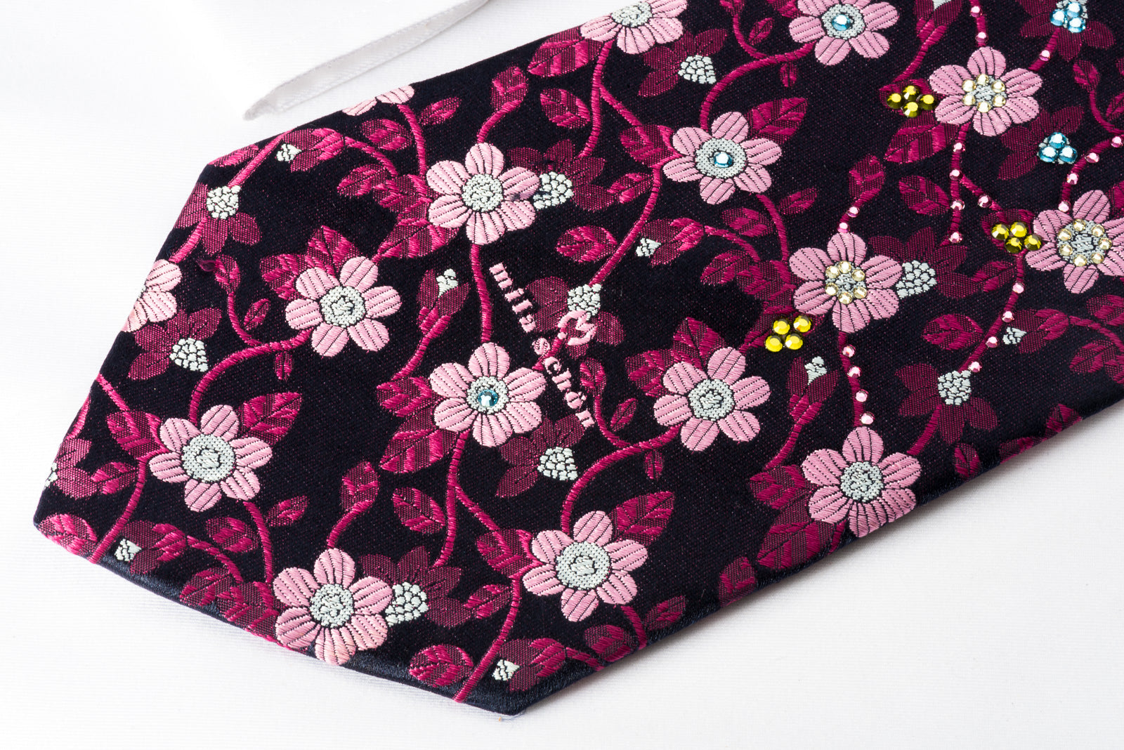 Beautiful men's woven silk Rhinestone necktie handmade and crafted by top brand name Mila Schon. Presenting a wonderful Floral design on dark purple woven silk and sparkling with white, red, green, blue crystal Rhinestones with silver sparkles.