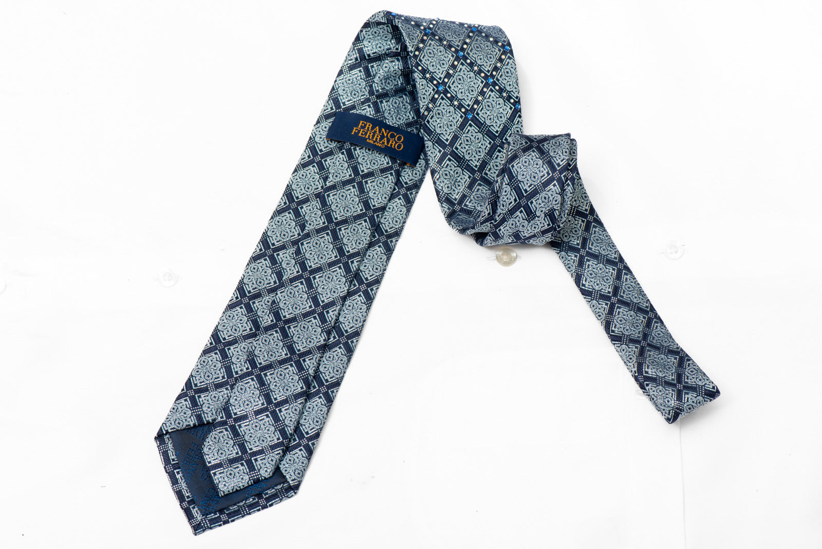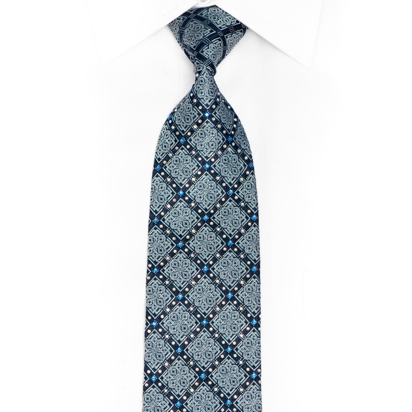 Elevate your formal wardrobe with this stunning woven silk necktie, where timeless sophistication meets contemporary design. Featuring an intricate geometric diamond pattern in rich navy and lustrous silver tones, this exceptional accessory is punctuated with brilliant blue rhinestone accents that catch the light with every movement.