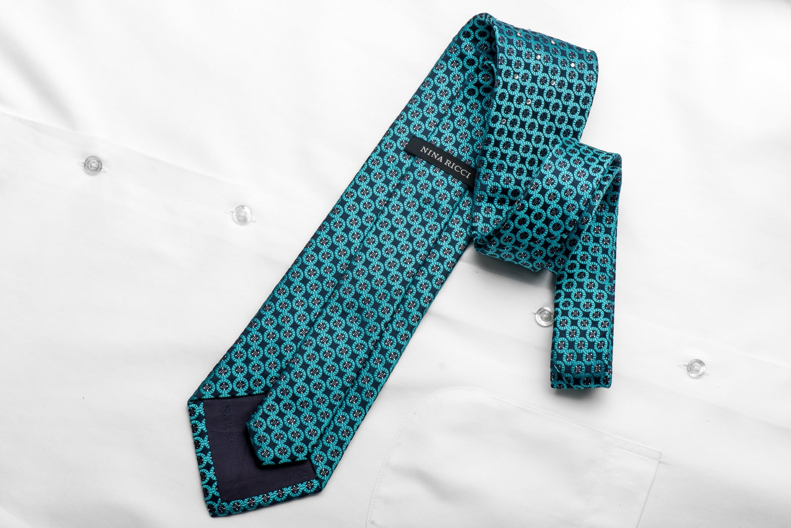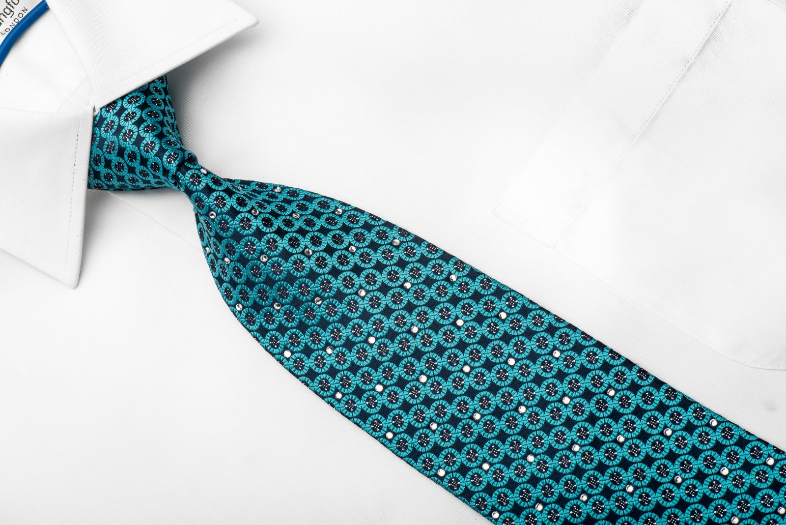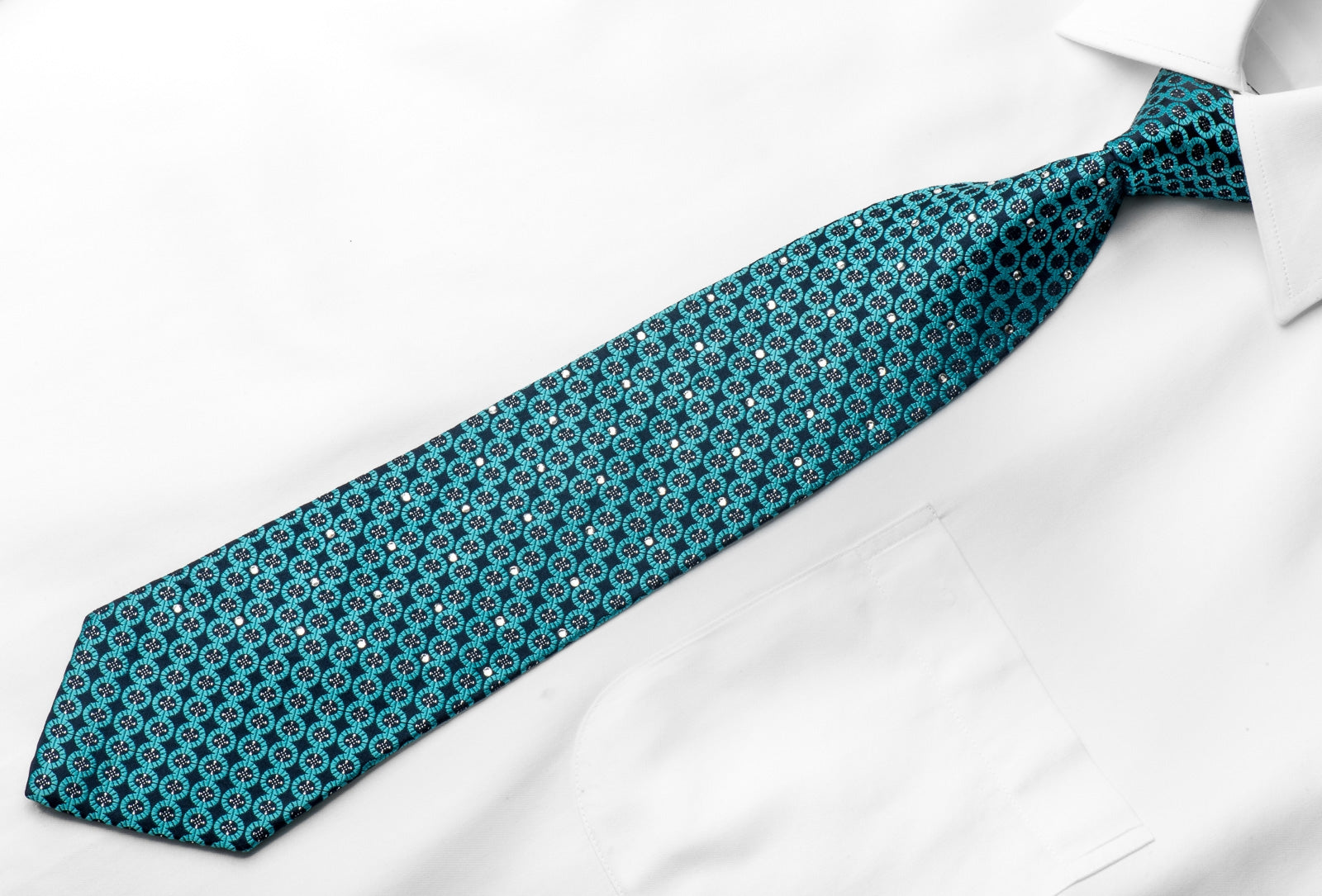 Stylish men's crystal Rhinestone necktie perfect for every occasion handmade from the finest quality silk and designed by top brand name Nina Ricci. Presenting an elegant geometric circles design on turquoise woven silk, embellished with metallic silver thread and sparkling with crystal Rhinestones.