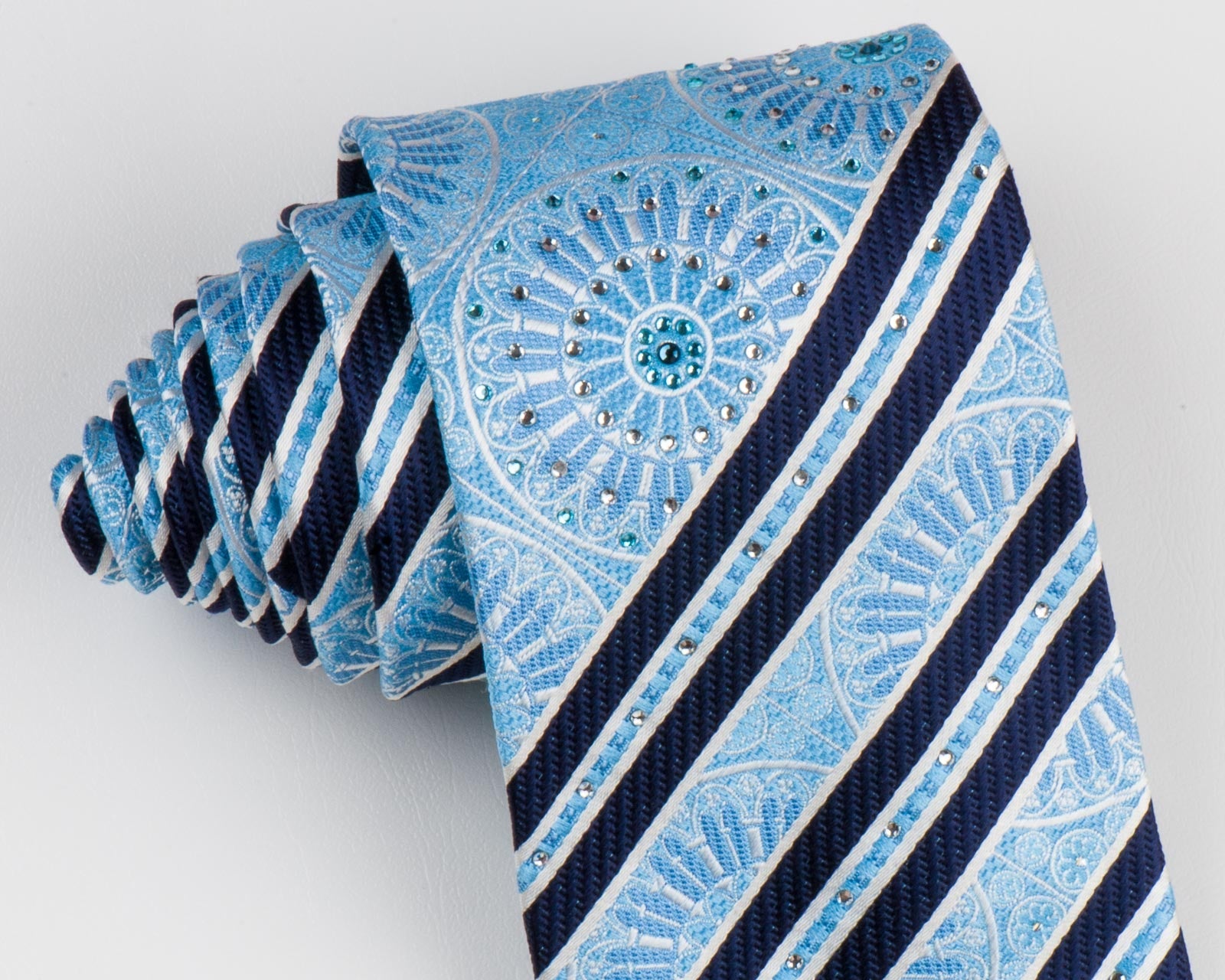 Gorgeous hand made woven silk neck tie by brand name Nina Ricci with Rhinestones, dark blue stripes on sky blue silk with white medallions and silver highlights complimented with clear white and blue Rhinestones.