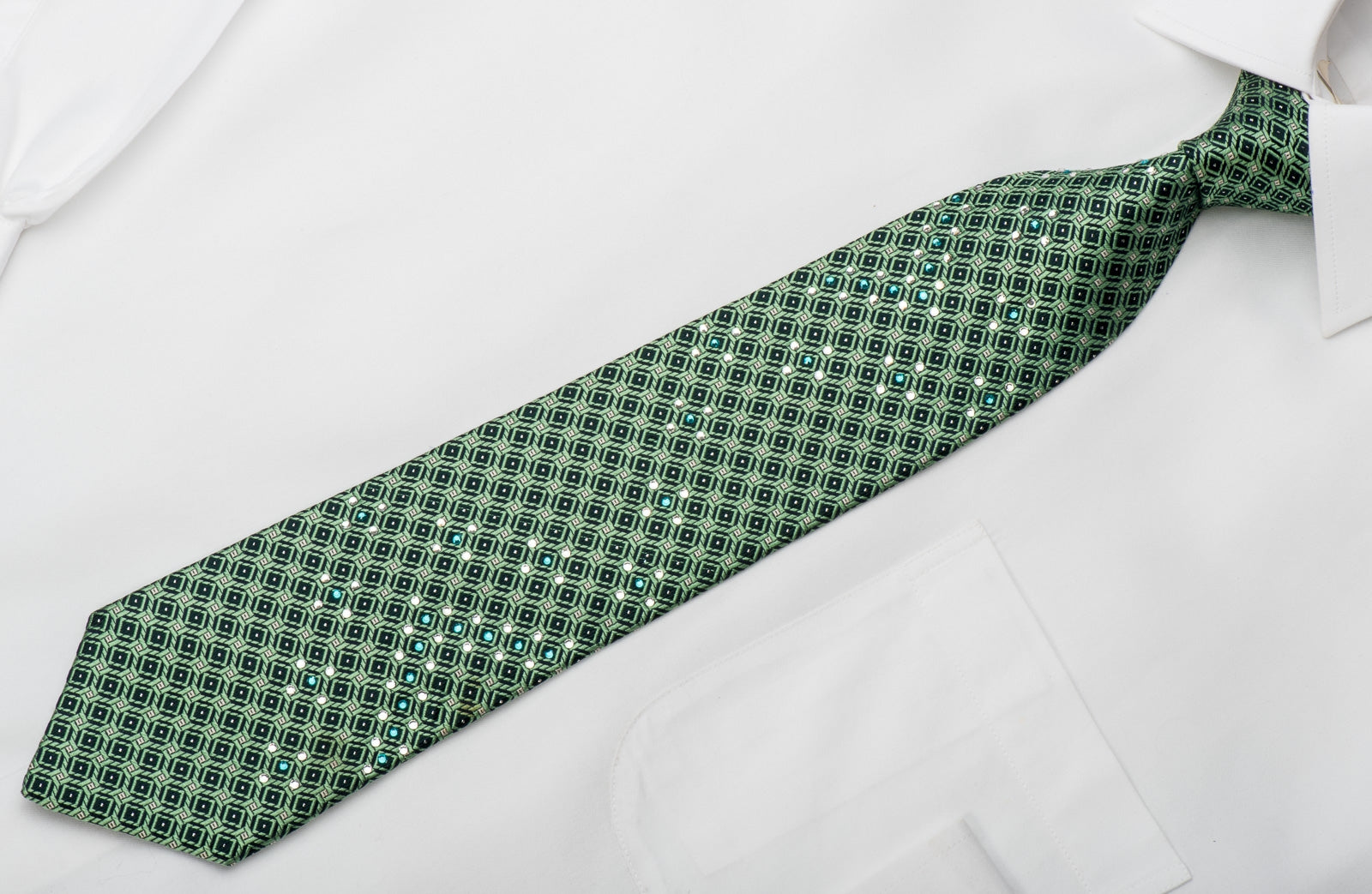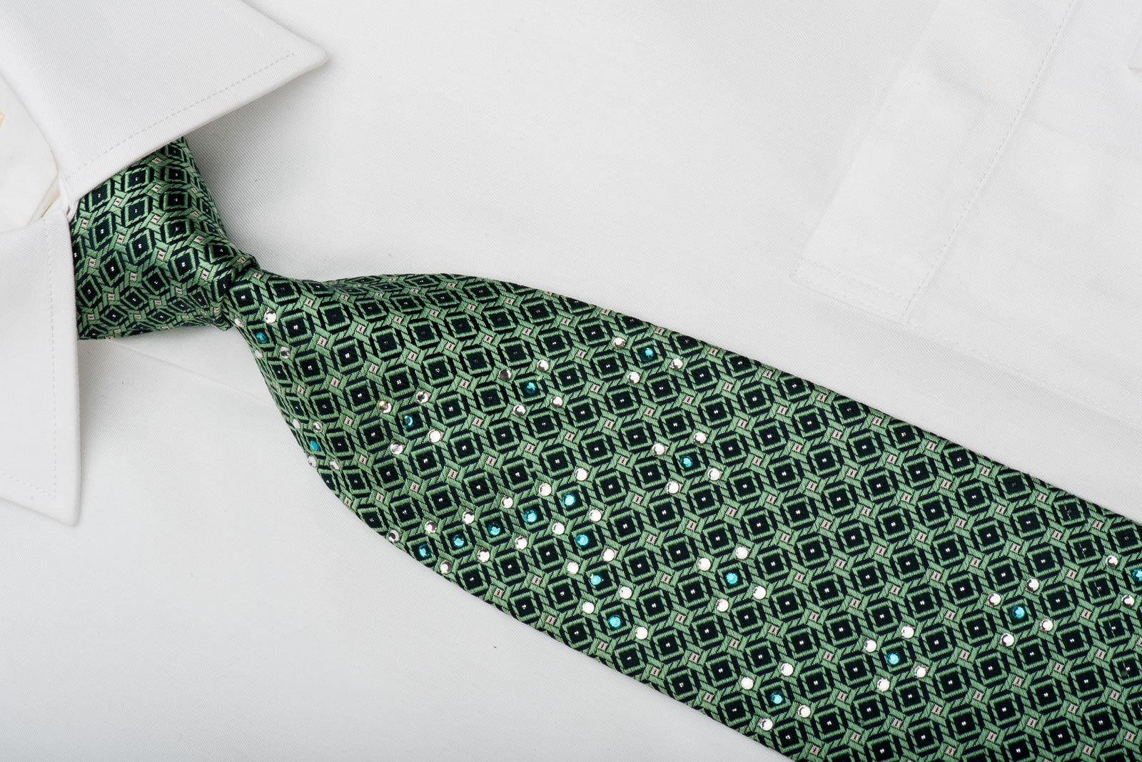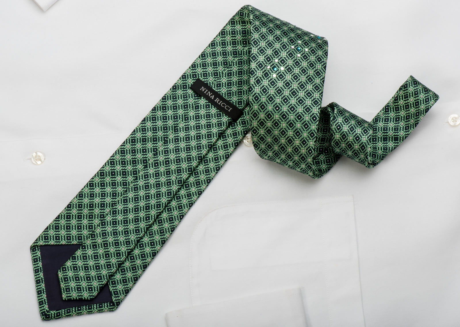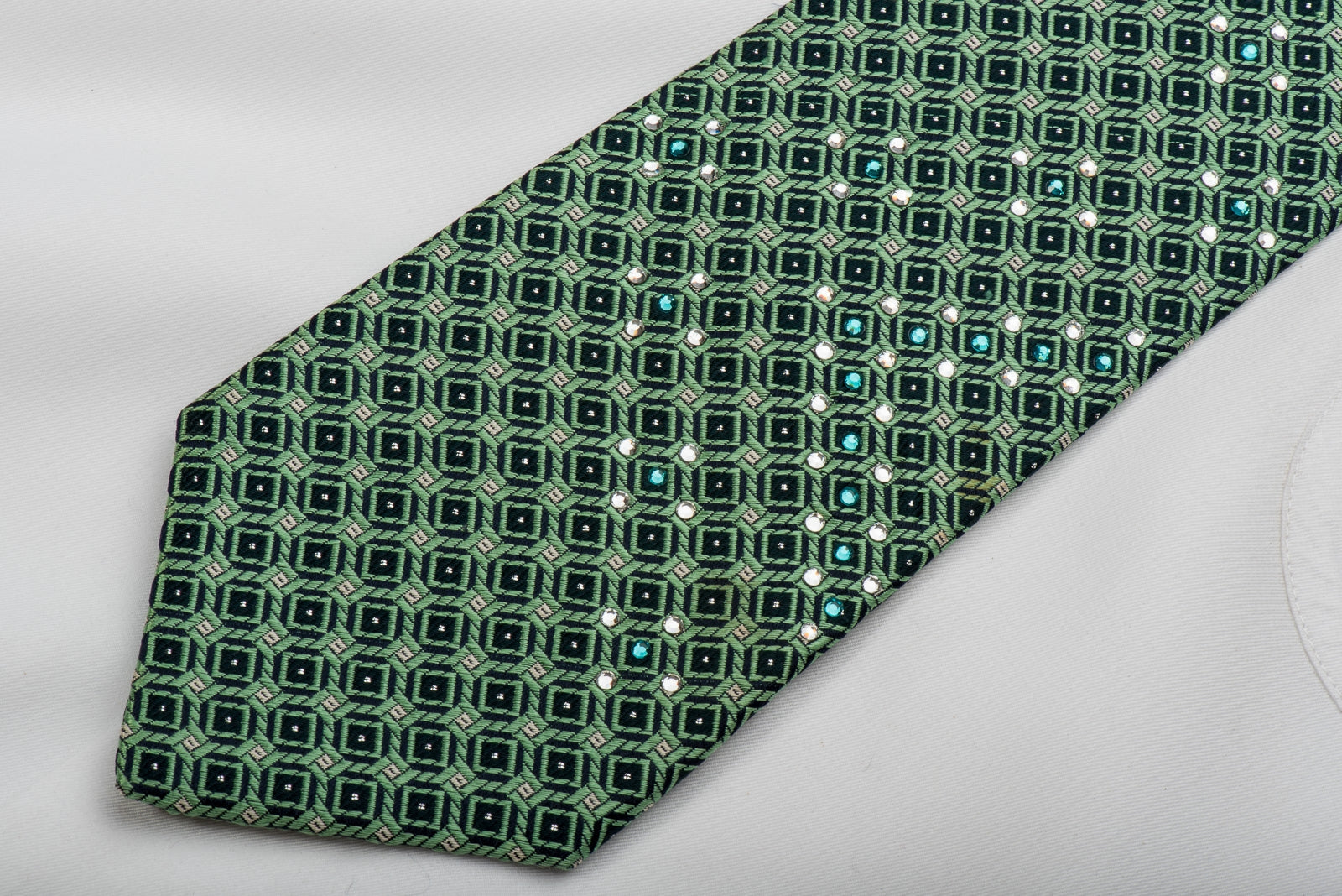 Stylish Rhinestone silk necktie perfect on every occasion handmade and designed by top brand name Nina Ricci. Presenting an elegant green Trellis design on woven dark blue silk, shining with white, green Rhinestones and silver sparkles.