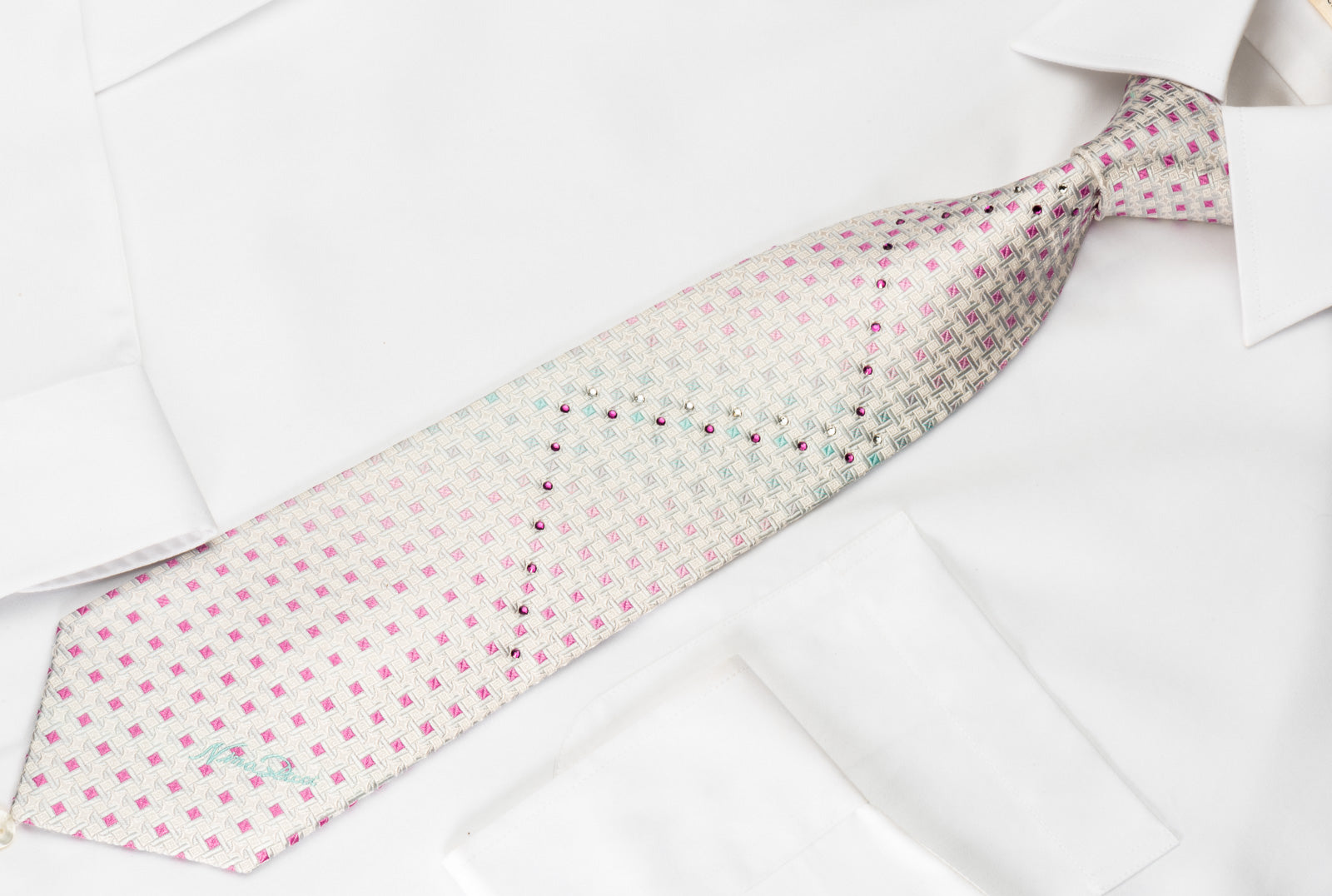 Stylish silk Rhinestone necktie perfect for any occasion handmade from the finest quality silk and designed by top brand name Nina Ricci. Presenting a gorgeous silver, pink Checker design on white silk, sparkling with clear white, pink crystal Rhinestones.