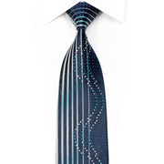 Stylish men's crystal Rhinestone necktie perfect for every occasion handmade from the finest quality silk and designed by top brand name Park Land. Presenting an elegant woven Vertical Striped and Waves design on navy blue, sparkling with clear white, blue Crystal Rhinestones and embellished with metallic blue sparkles.