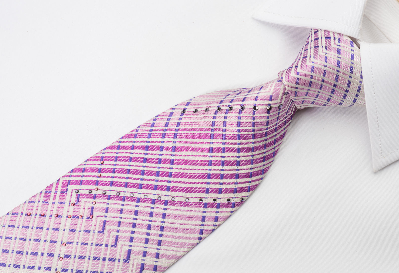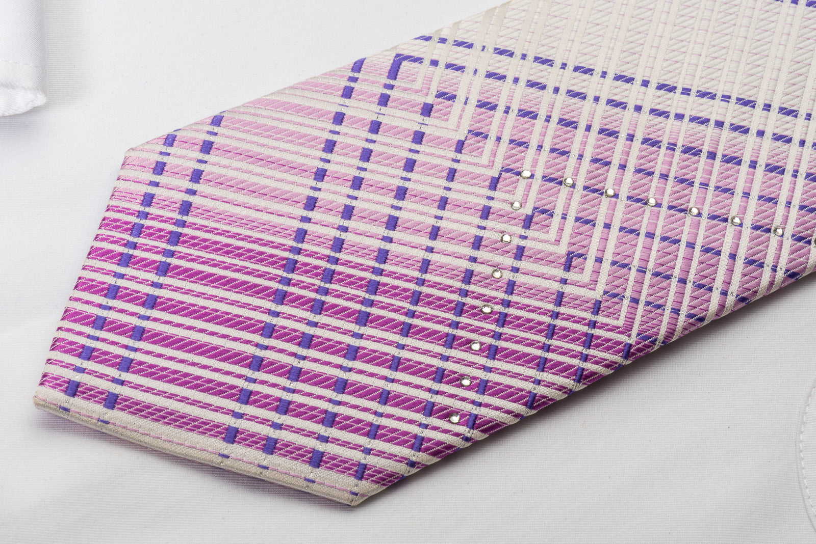 Gorgeous handmade men's woven silk Rhinestone necktie handmade and designed by top brand name Park Land. Presenting a stylish mauve Chevron striped design on white silk and sparkling with clear white, pink crystal Rhinestones with silver sparkles.