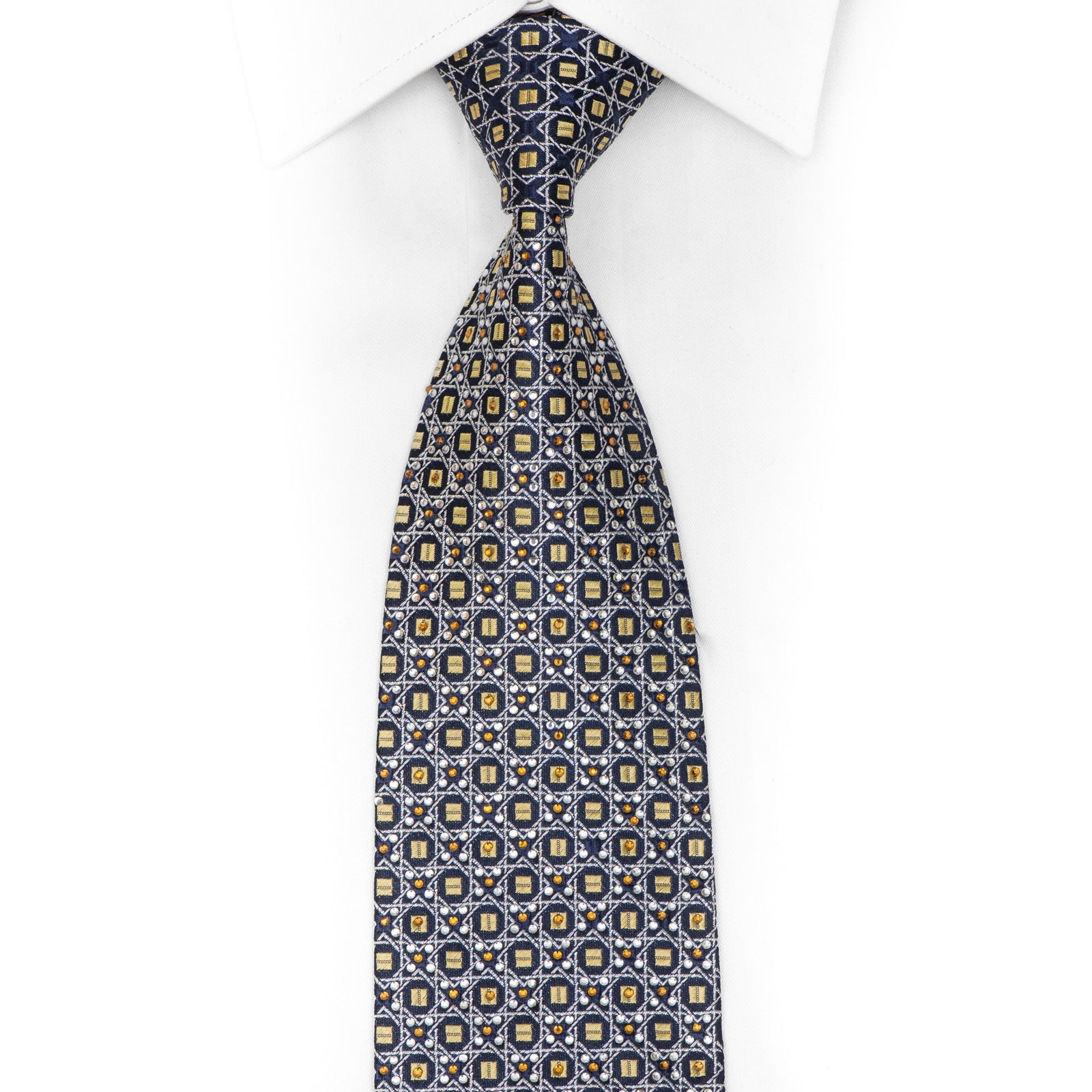 This is a stylish, handcrafted men's silk necktie featuring a beautiful silver and gold Trellis pattern on a blue background. Adorned with dazzling white and orange crystal Rhinestones and shimmering metallic silver accents, it's the perfect accessory to add some sparkle to any outfit.