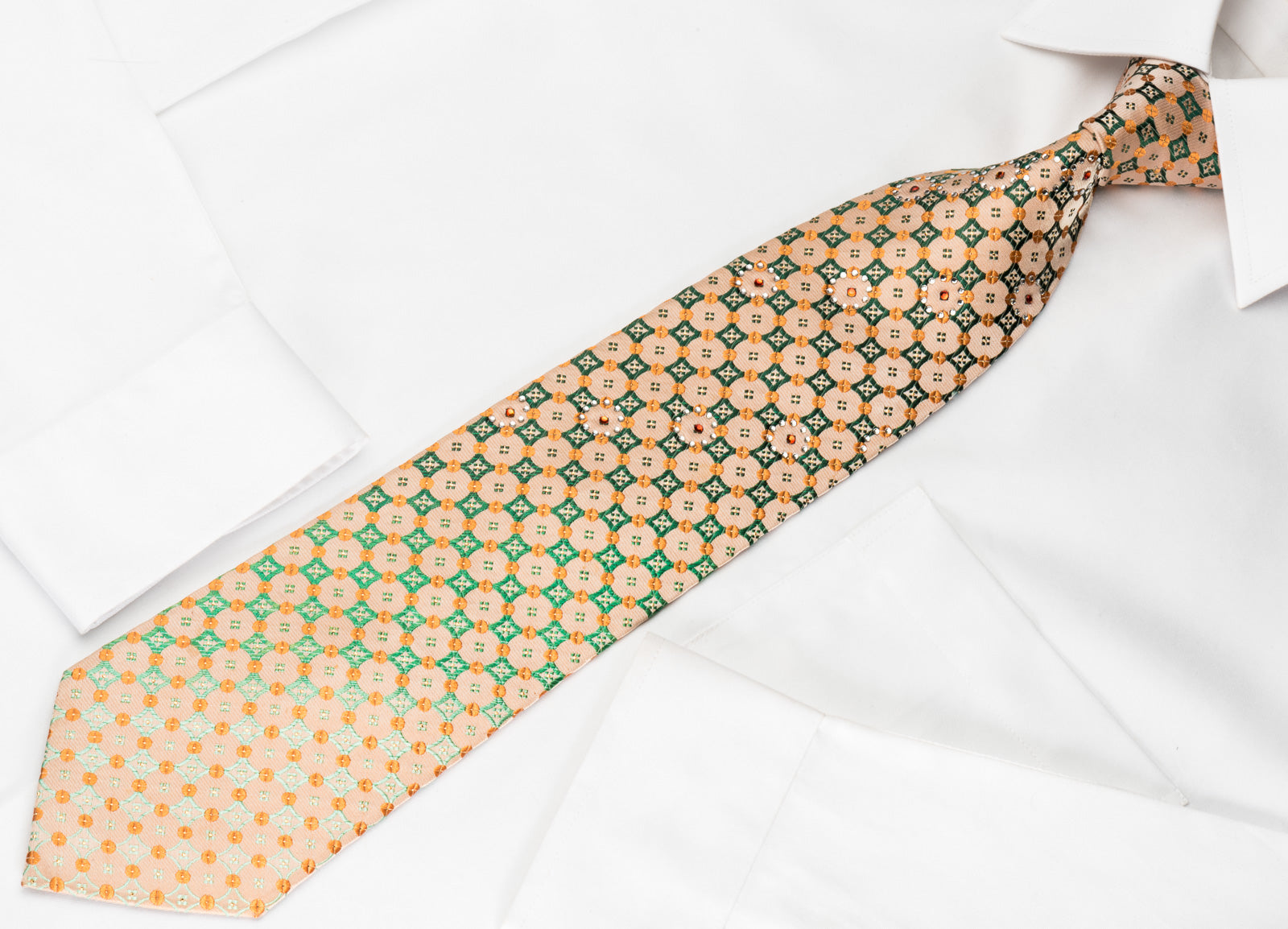 Gorgeous men's woven silk Rhinestone necktie handmade and designed by top brand name Perry Ellis. Presenting a stylish green, orange Foulard Checked design on peach pink silk and sparkling with white, orange crystal Rhinestones and silver sparkles.