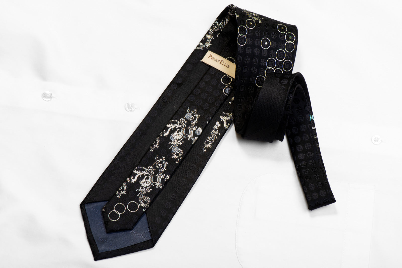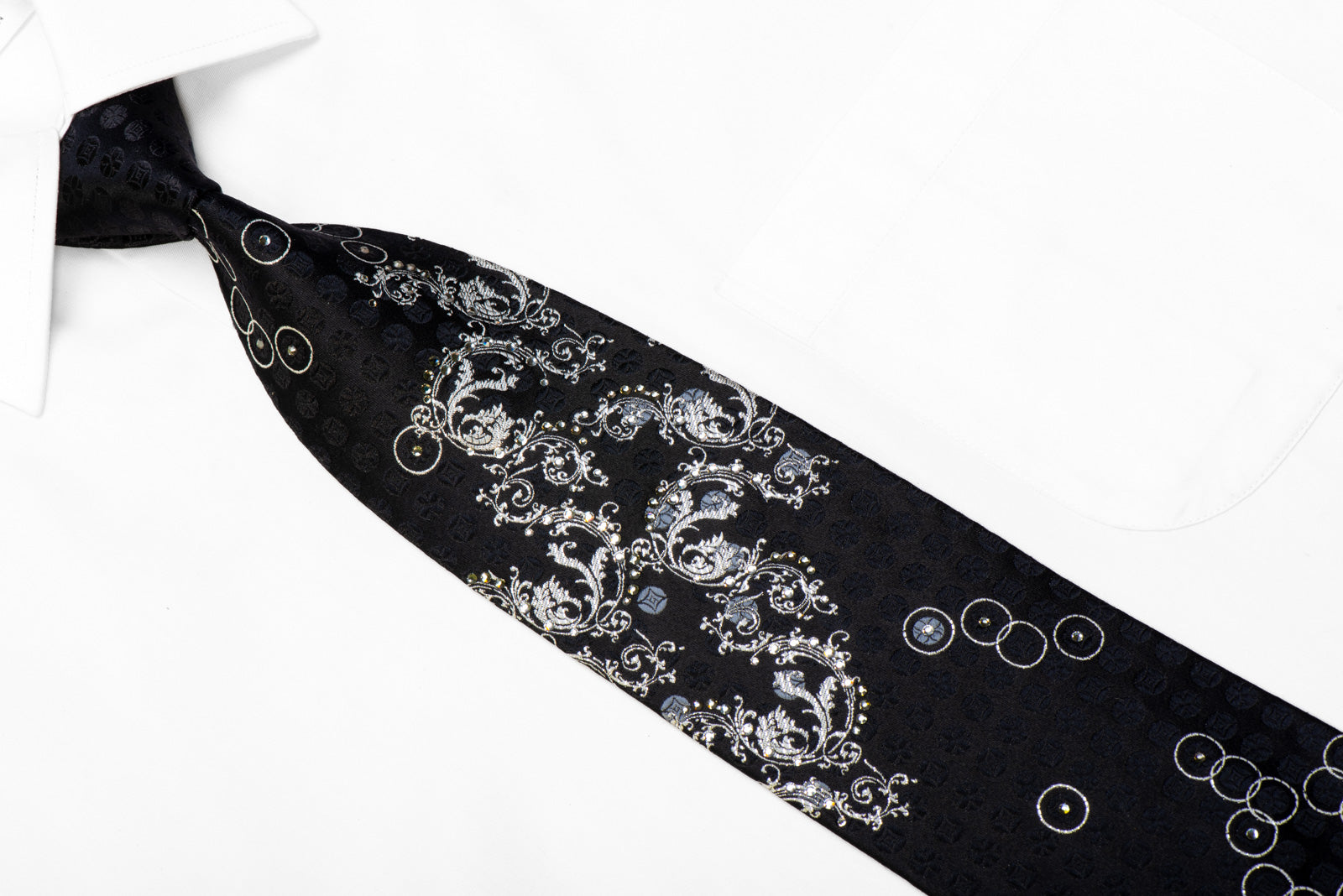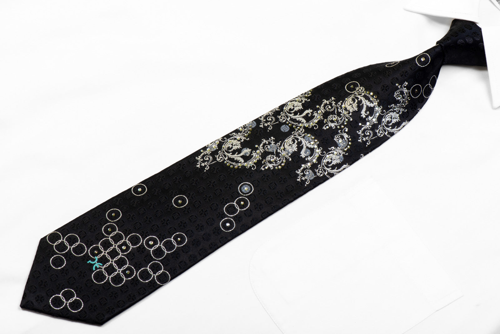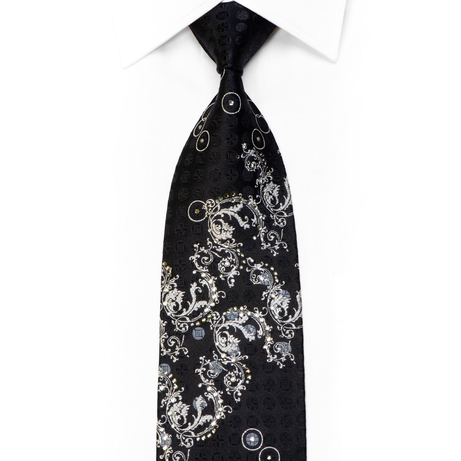 Material - SilkDesign - Acanthus, ScrollsColor - Black, SilverLength - Classic (57 in.-60 in.)(145 cm-153 cm)Width - Classic (3 1/4 in.-3 3/4 in.)(8 cm-9.5 )cmSpecial Features - Crystal Rhinestones, Silver Sparkles