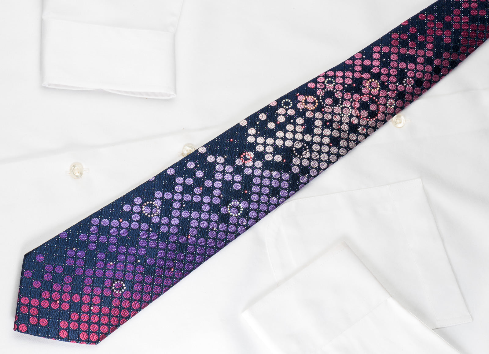 Stand out in a crowd wearing this gorgeous handmade men's woven silk Rhinestone necktie, made from the finest quality silk and designed by top brand name Pierre Cardin. Presenting a stylish design with geometric pink, purple dots on blue silk, sparkling with clear white, pink Rhinestones and silver sparkles.