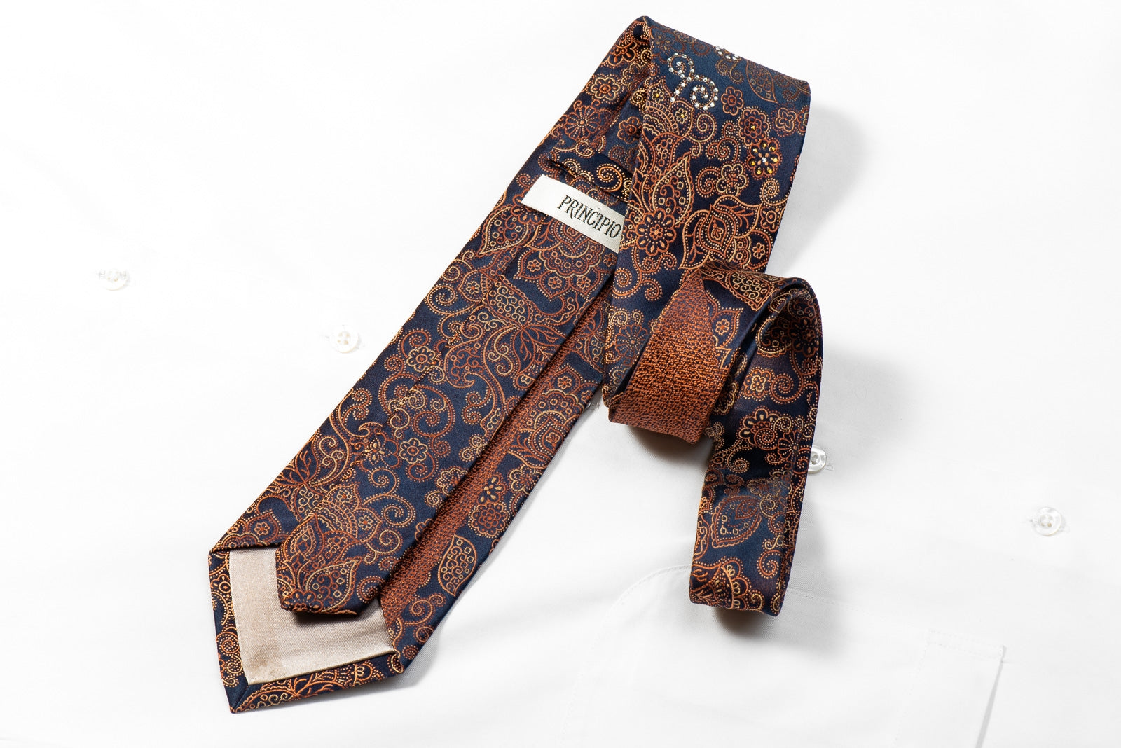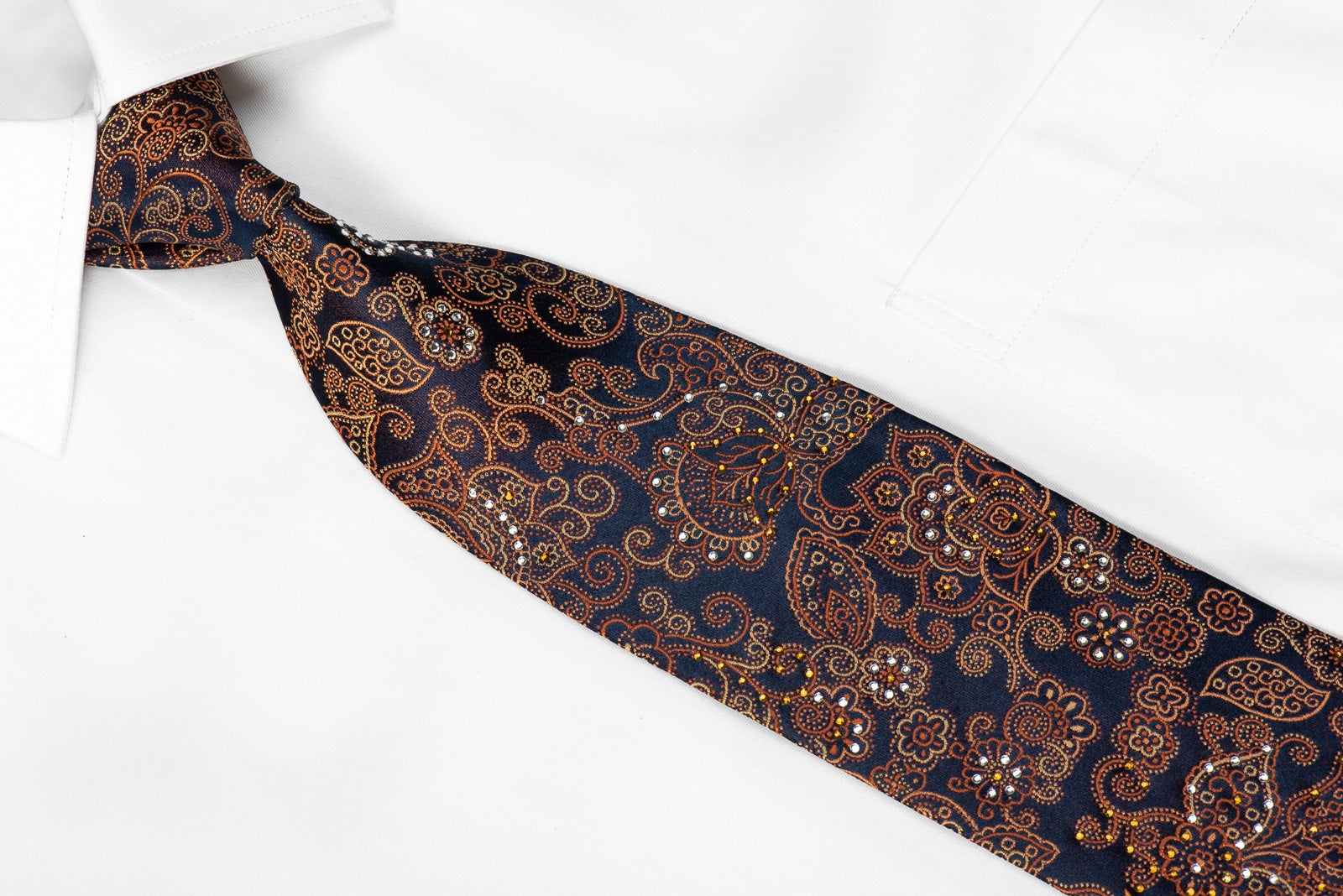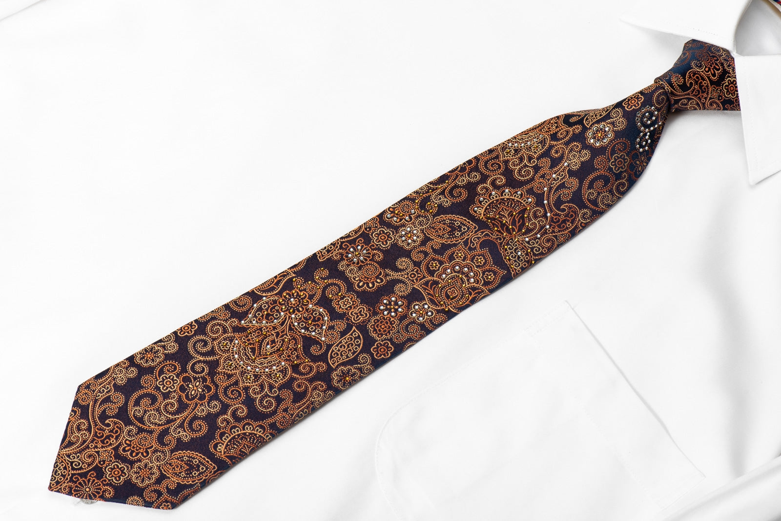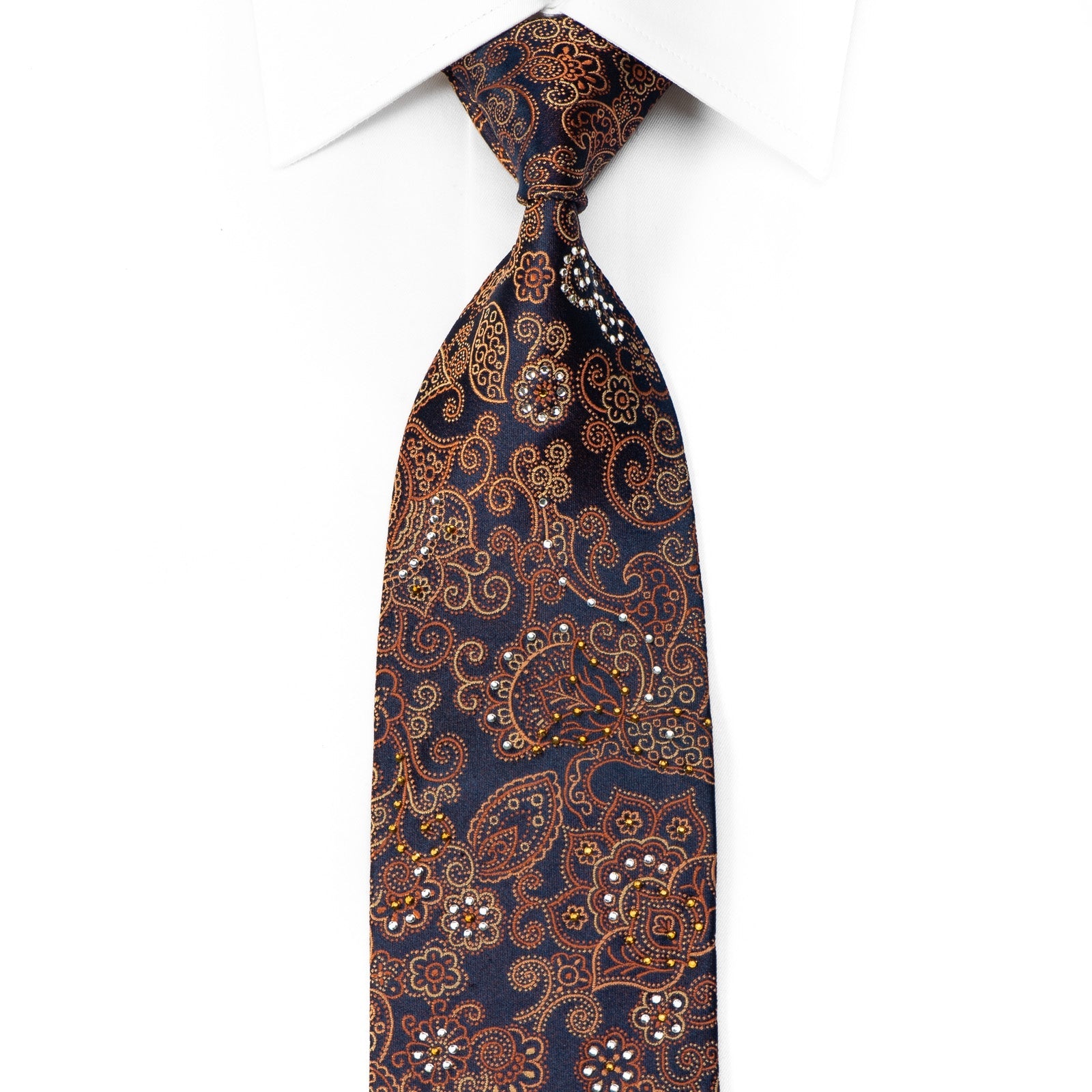 Stylish men's crystal Rhinestone tie perfect for every occasion handmade from the finest quality silk and designed by top brand name Principio. Presenting an elegant woven orange Anthemion design on navy blue. sparkling with clear white, orange crystal Rhinestones.