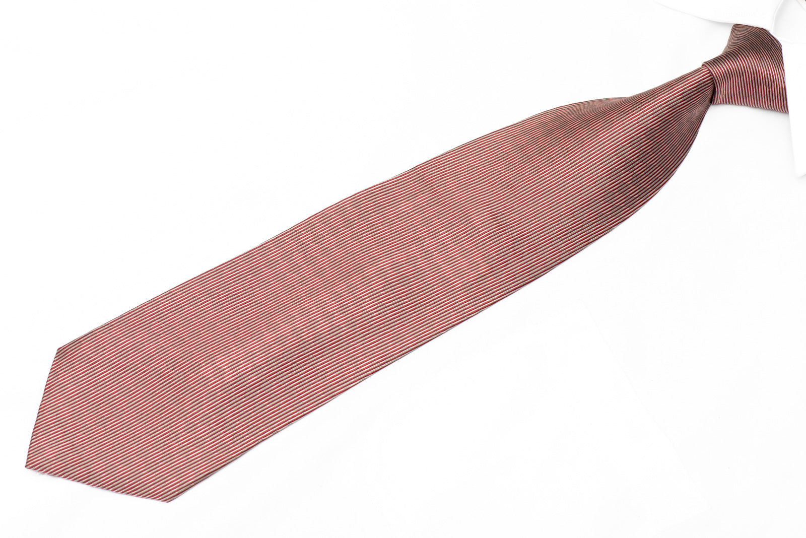 Elevate your formal wardrobe with this meticulously woven silk necktie, featuring fine diagonal pinstripes in rich burgundy and silver tones with a subtle metallic sheen. Crafted from premium silk, this tie showcases exceptional texture and depth through its intricate striped weave.