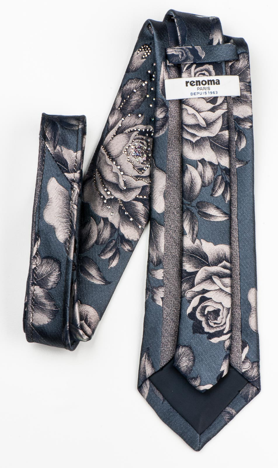Gorgeous hand made men's woven silk Tie by Renoma presenting a beautiful silver floral design on gray / blue featuring clear white Rhinestones.