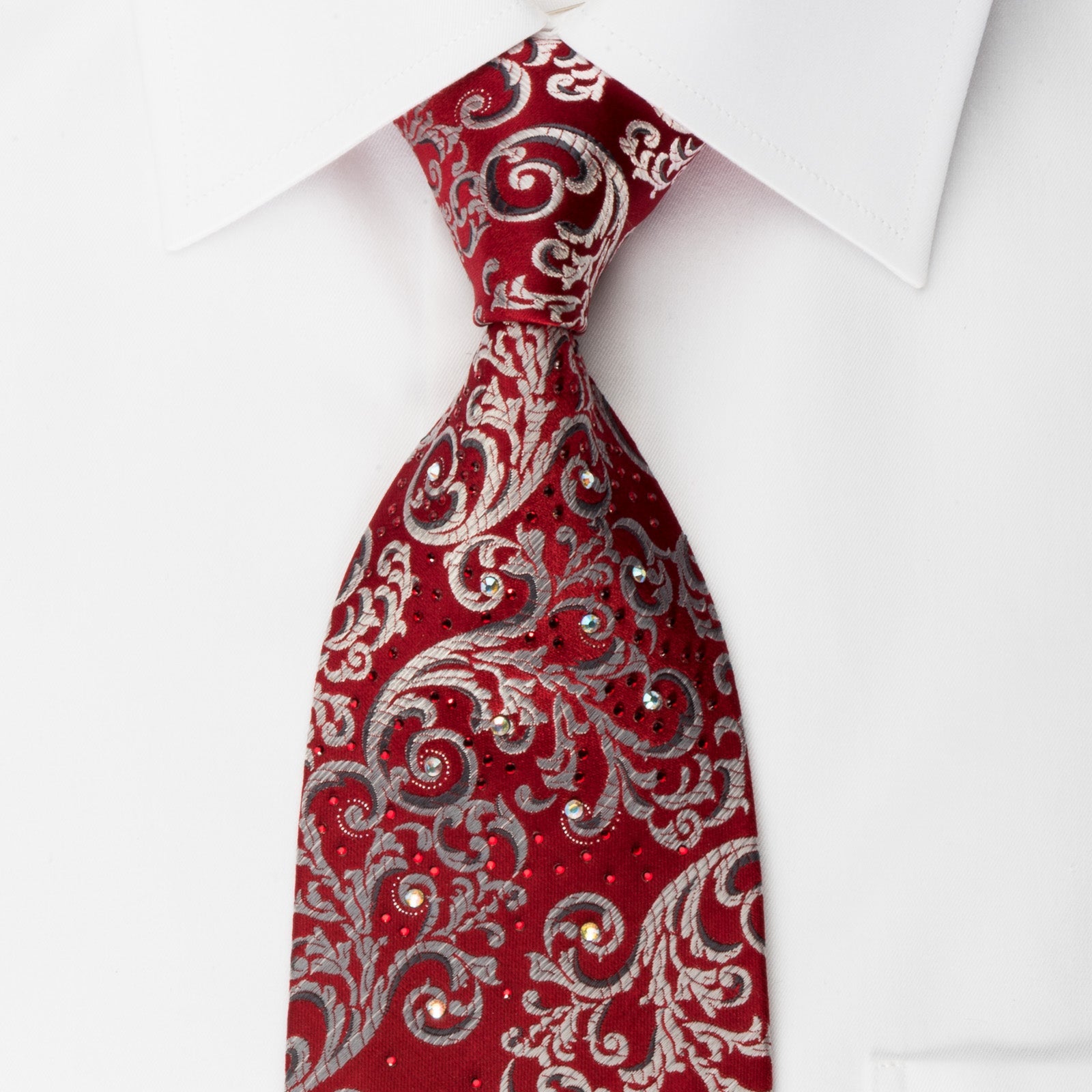 Stand out in a crowd wearing one of these gorgeous handmade men's woven silk Rhinestone neckties designed by top brand name Renoma. Presenting a stylish design with silver Vines on burgundy silk and sparkling with clear white, red crystal Rhinestones with silver sparkles.