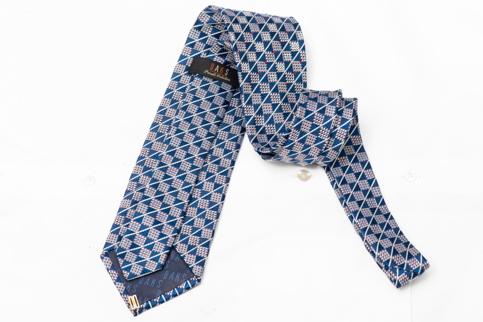 Elevate your formal wardrobe with this exquisite woven silk necktie, where classic sophistication meets contemporary brilliance. Crafted from premium silk, this distinguished accessory features an intricate geometric pattern in rich navy blue, accented with silver-toned rhinestone embellishments that catch the light with every movement.