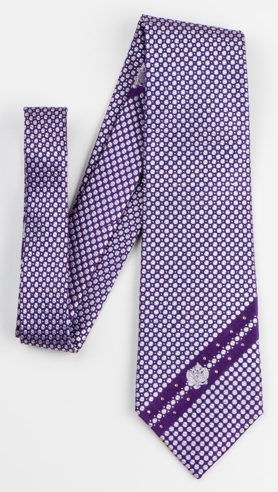 Stylish silk Rhinestone Tie hand made and designed by brand name Renoma, presenting an elegant design with geometric silver dots on purple silk with silver sparkles, perfectly complemented by bright micro clear white Rhinestones.