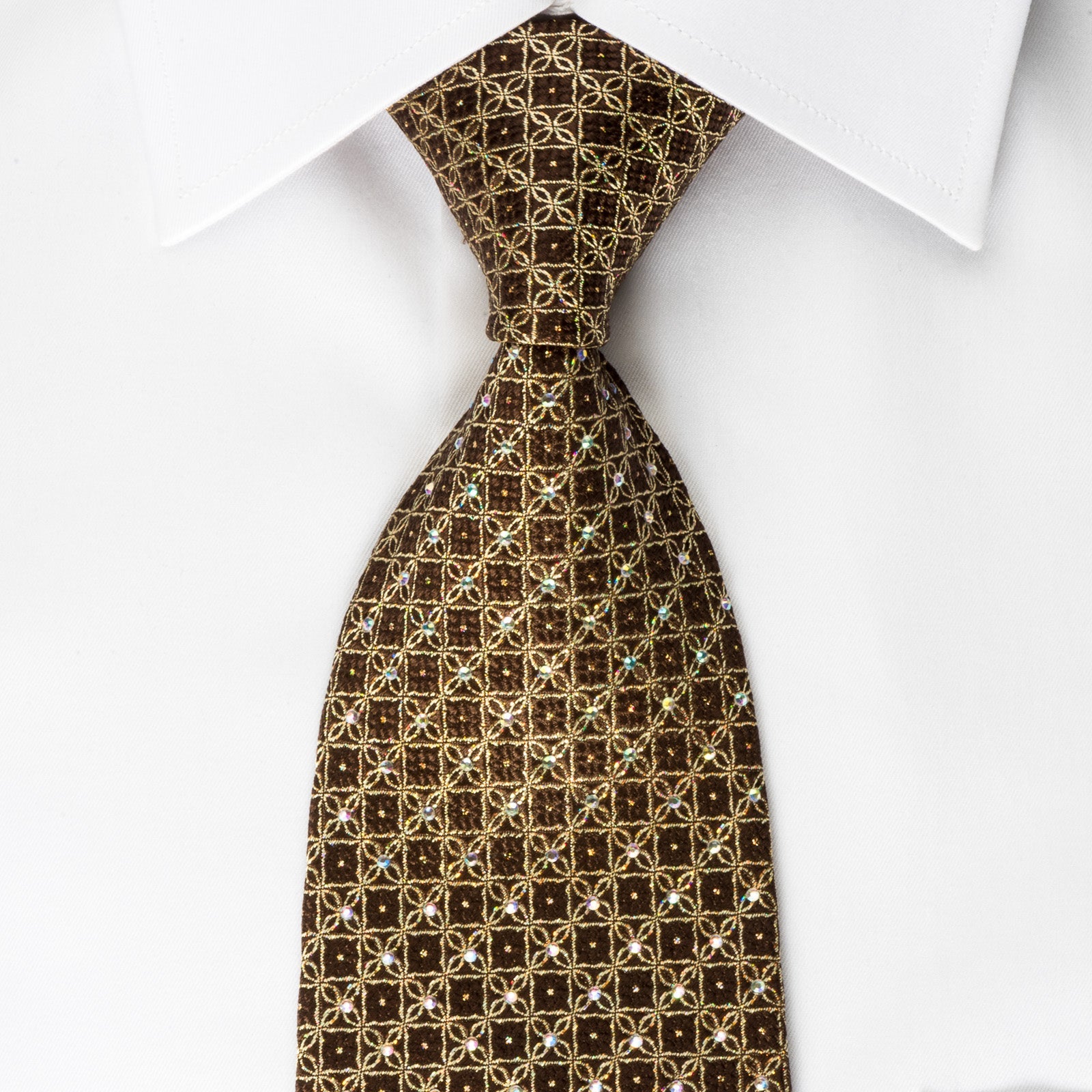 Stylish silk Rhinestone necktie perfect for any occasion handmade and designed by top brand name Roberta di Camerino. Presenting an elegant Golden Trellis design on brown woven silk and sparkling with crystal Rhinestones and golden sparkles.