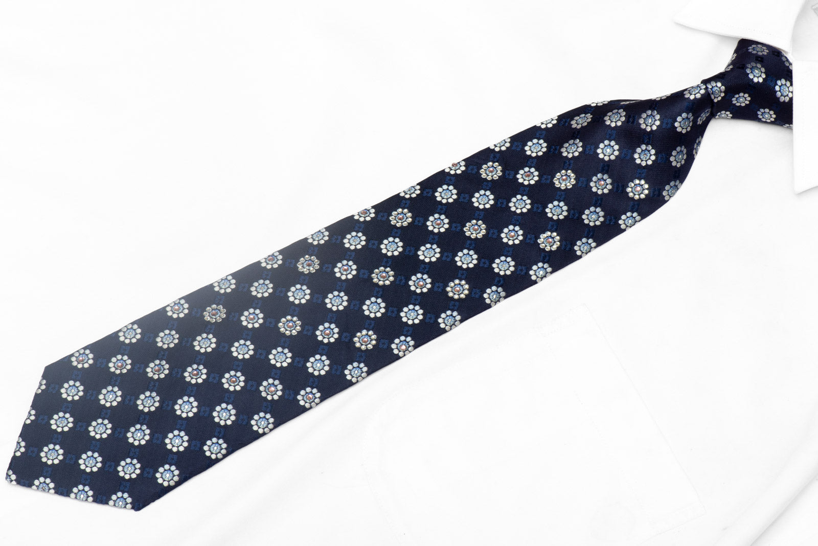 Experience elegance with our Silver Floral On Navy Rhinestone Silk Necktie. This stunning tie features delicate floral designs over a deep navy background, adorned with sparkling silver rhinestones for a touch of glamour. Perfect for adding a touch of sophistication to any outfit.