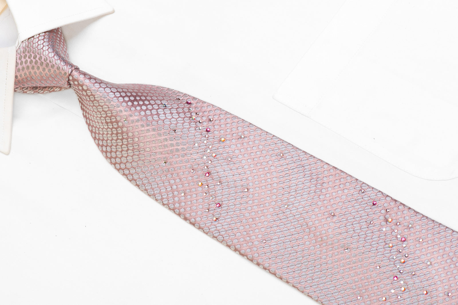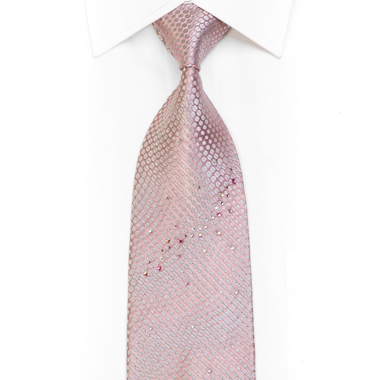 Beautiful men's handmade Rhinestone silk tie. Presenting a woven Geometric silver Dots design on salmon pink silk. Sparkling with clear pink, white and crystal AB Rhinestones.