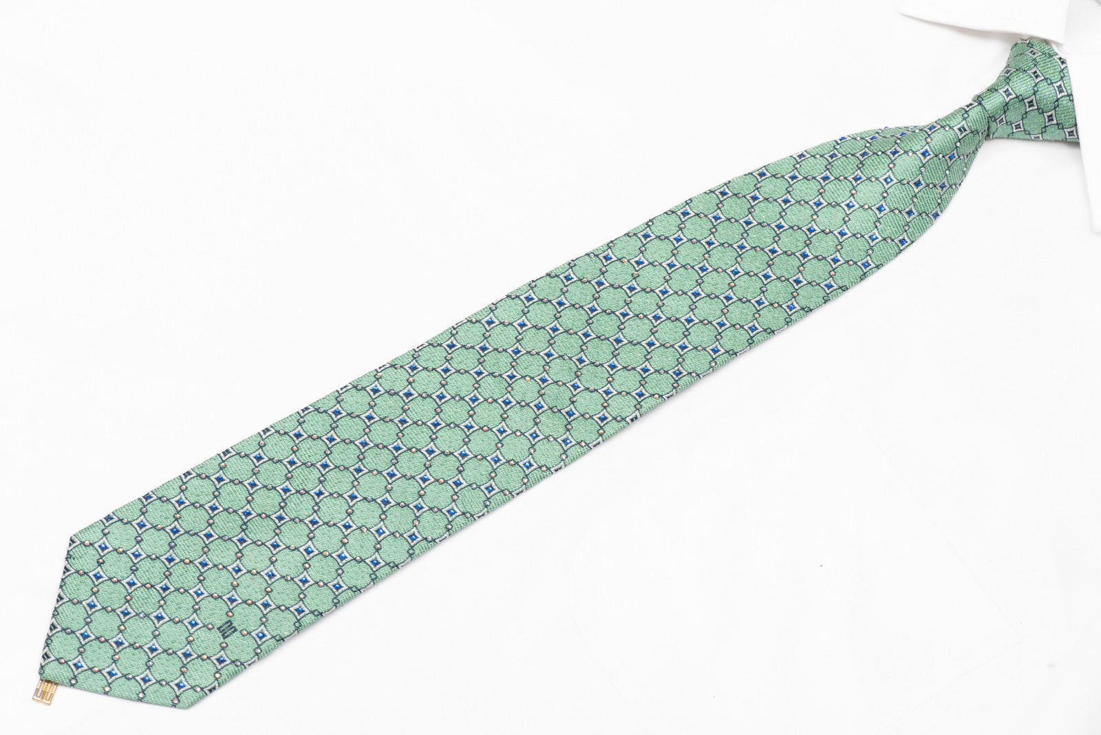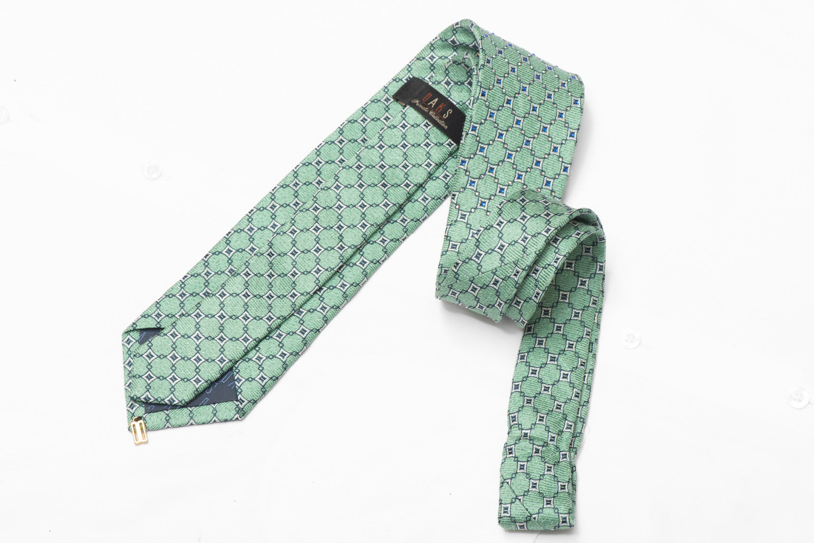 Add some sparkle to your wardrobe with this stunning Silver Geometric On Mint Green Rhinestone Silk Necktie. Made with a stylish combination of silver and mint green, this tie is sure to impress with its subtle shimmer. Perfect for any occasion, this tie is a must-have for any fashion-forward individual.