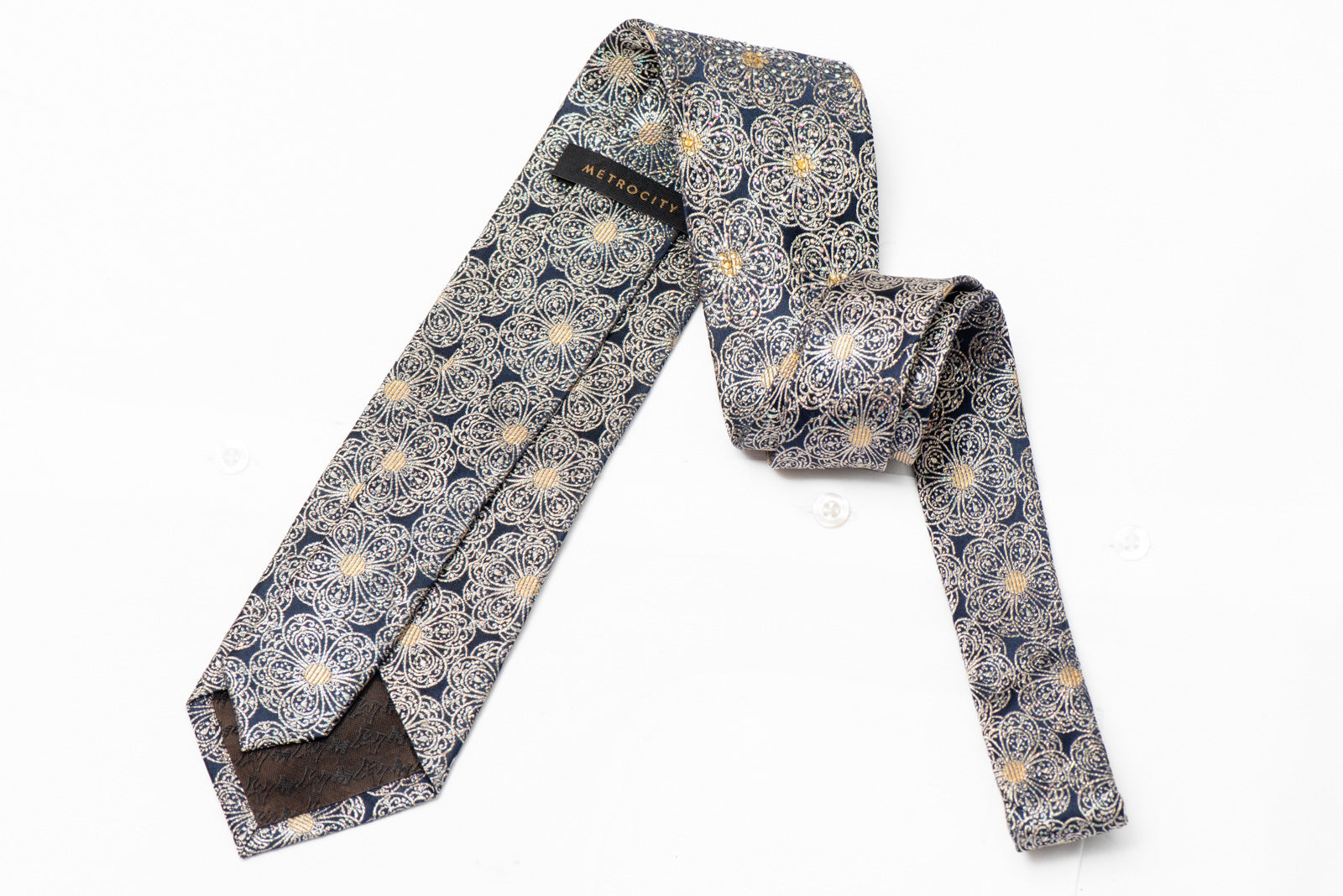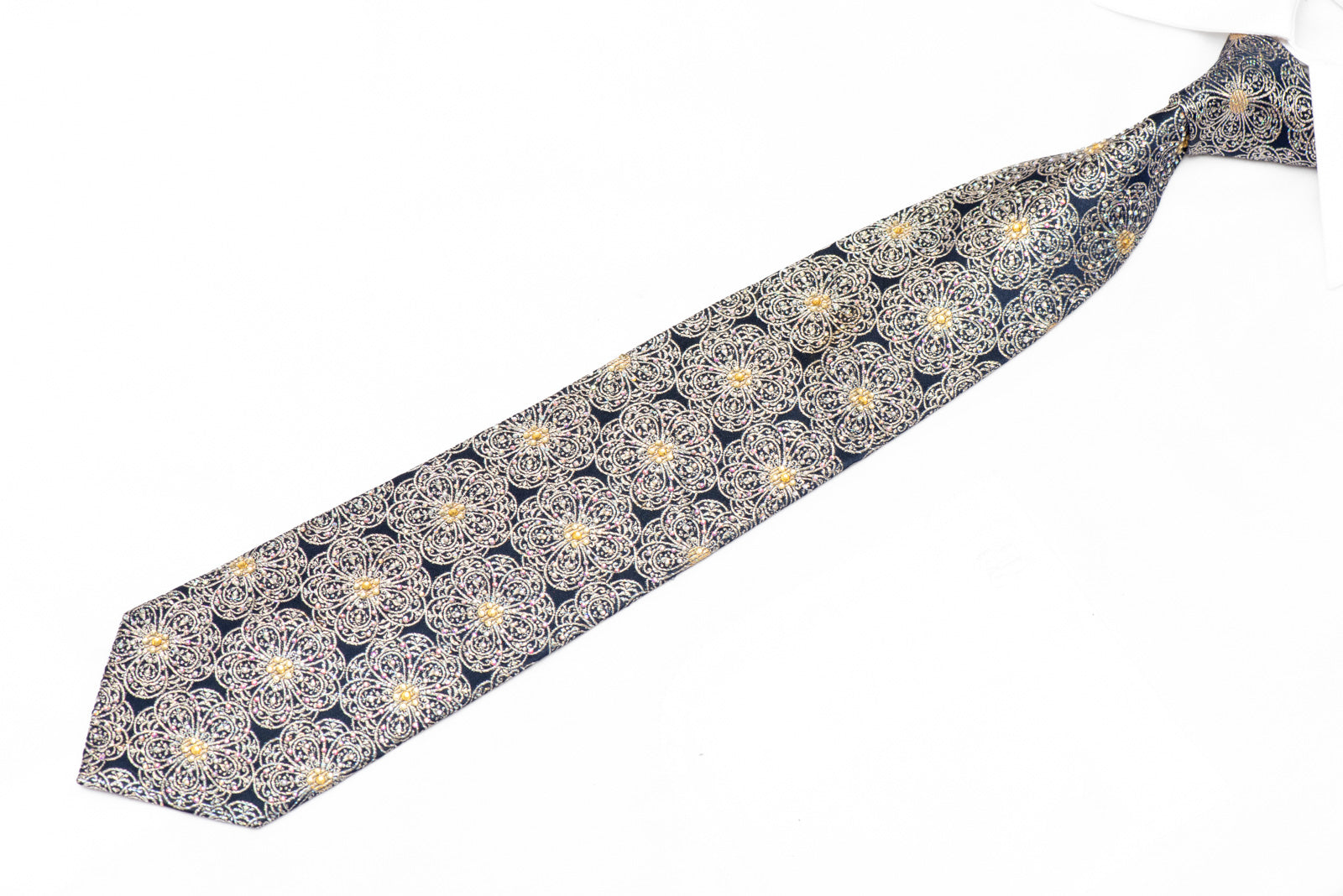 Silver Medallions On Navy Blue Rhinestone Tie With Silver