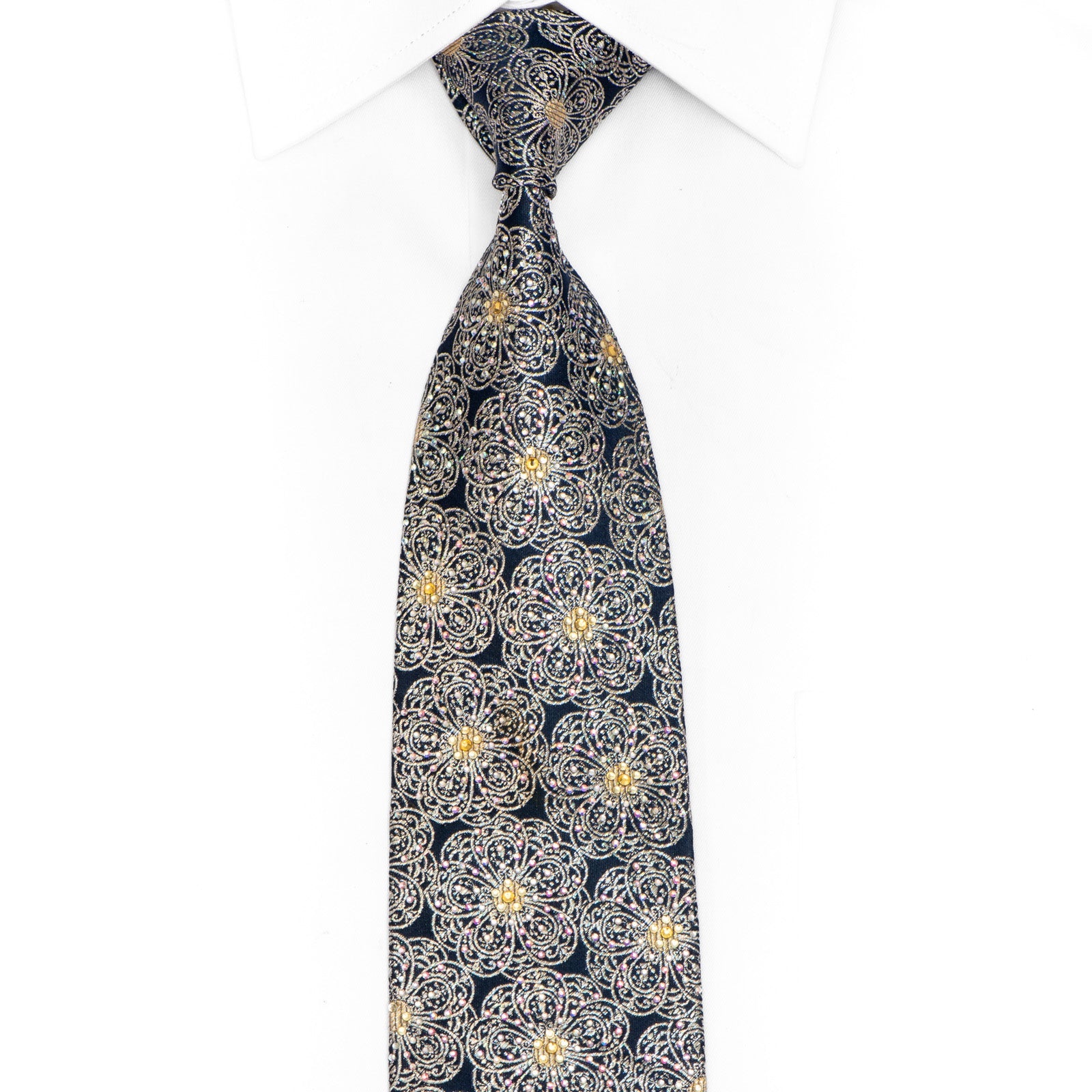 Elevate your look with this navy blue tie adorned with silver medallions and shimmering rhinestones, enhanced by delicate silver sparkles for a refined finish.