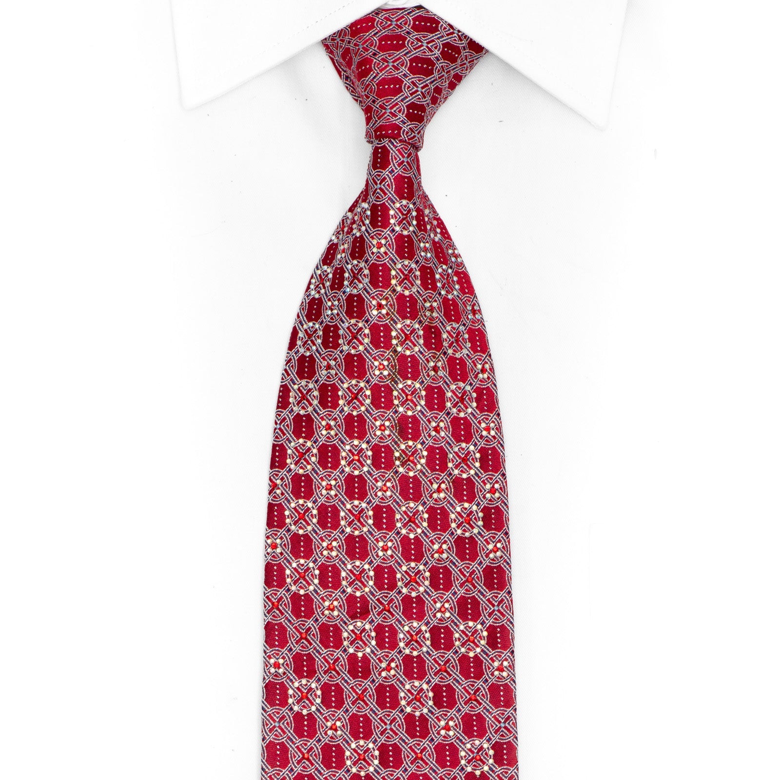 Silver Trellis On Dark Red Rhinestone Silk Tie With Silver Sparkles