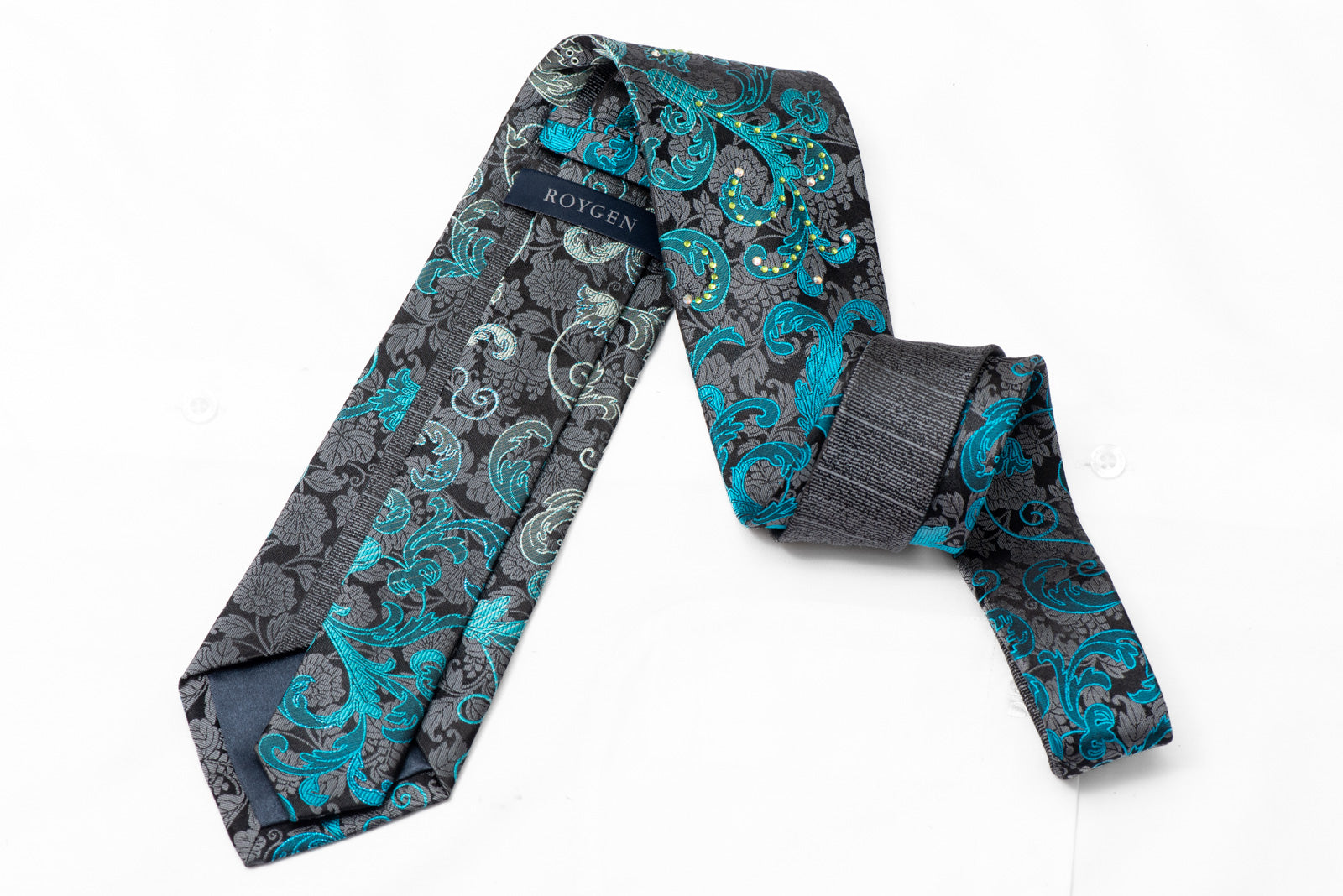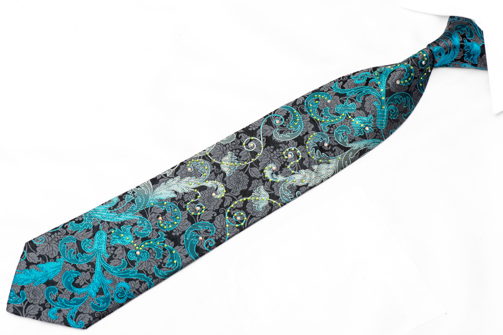 Material - SilkDesign - Acanthus, ScrollsColor - Black, Silver, TurqoiseLength - Classic (48 in.-60 in.)(145cm-153 cm)Width - Classic (3 1/4 in.-3 3/4 in.)(8 cm-9.5 cm)Special Features - Rhinestones, Silver Sparkles