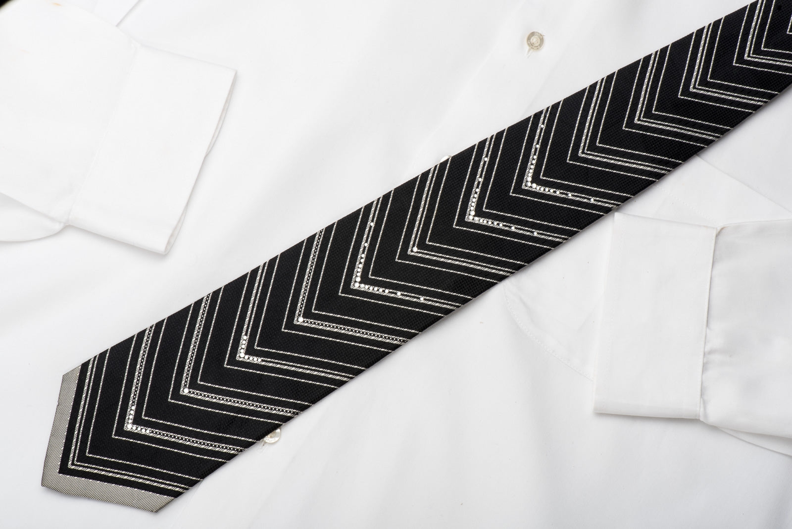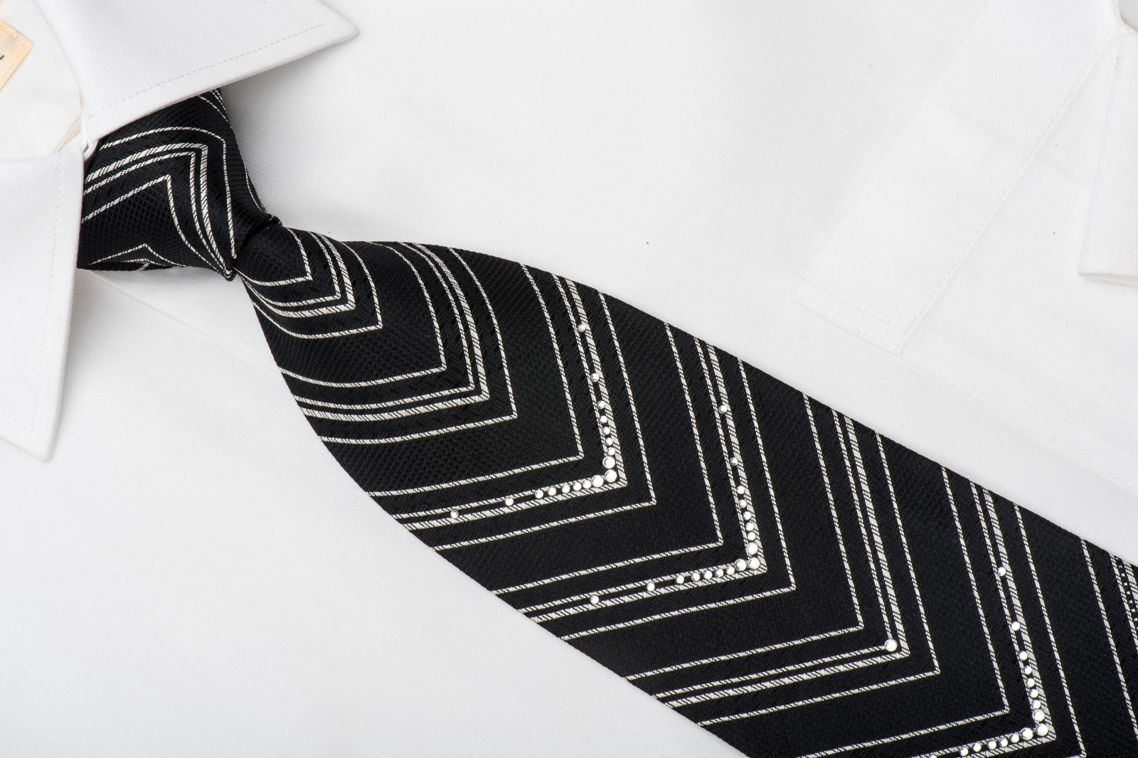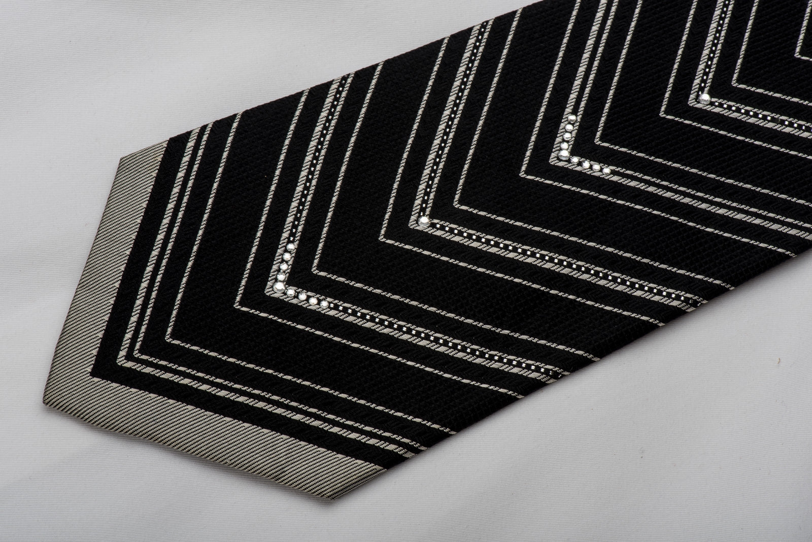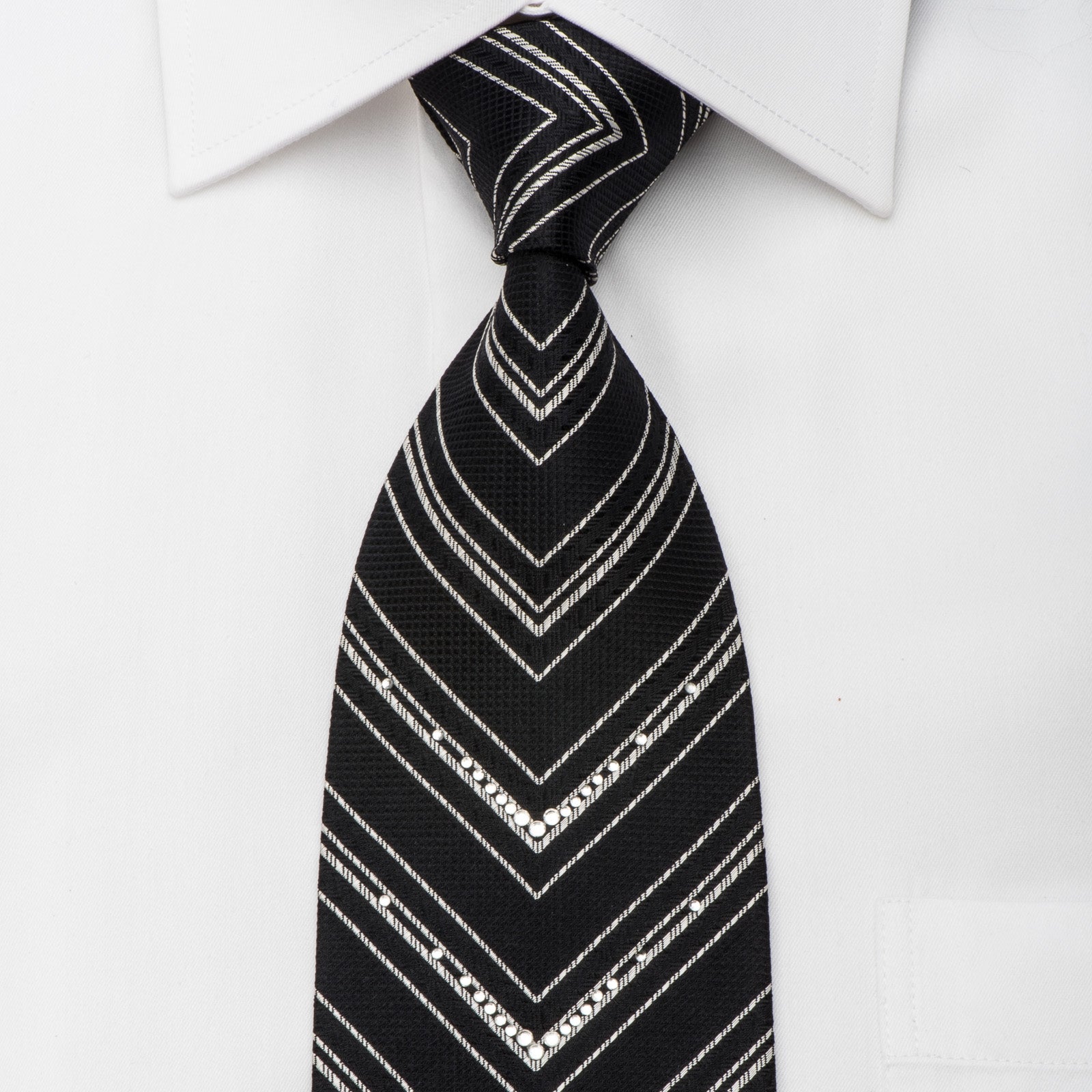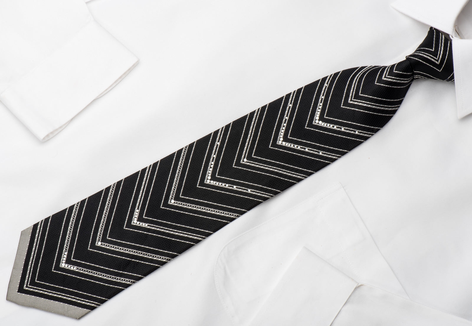 Stylish men's Rhinestone silk necktie perfect for every occasion handmade from the finest quality silk and designed by top brand name Tino Cosma. Presenting an elegant silver V-Striped design on woven black silk and sparkling with white crystal Rhinestones and silver sparkles.