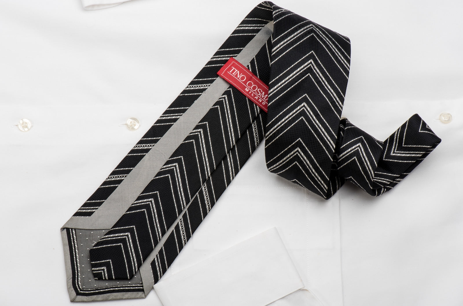 Tino Cosma Men’s Rhinestone Silk Necktie Silver V-Striped On