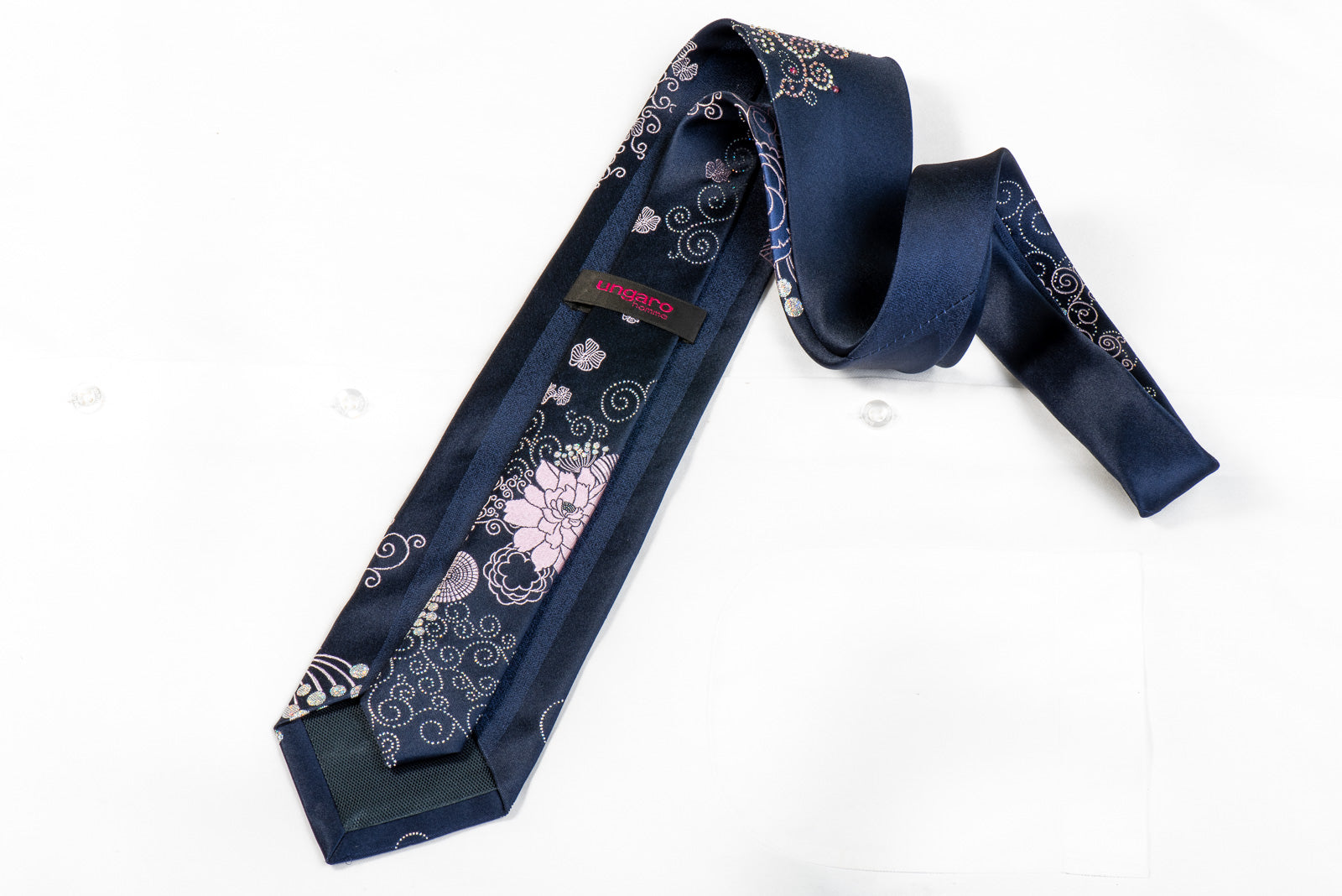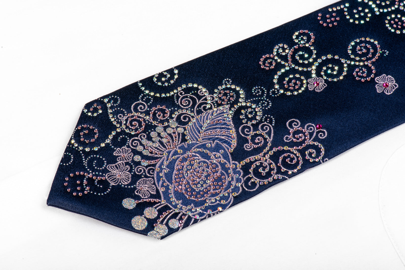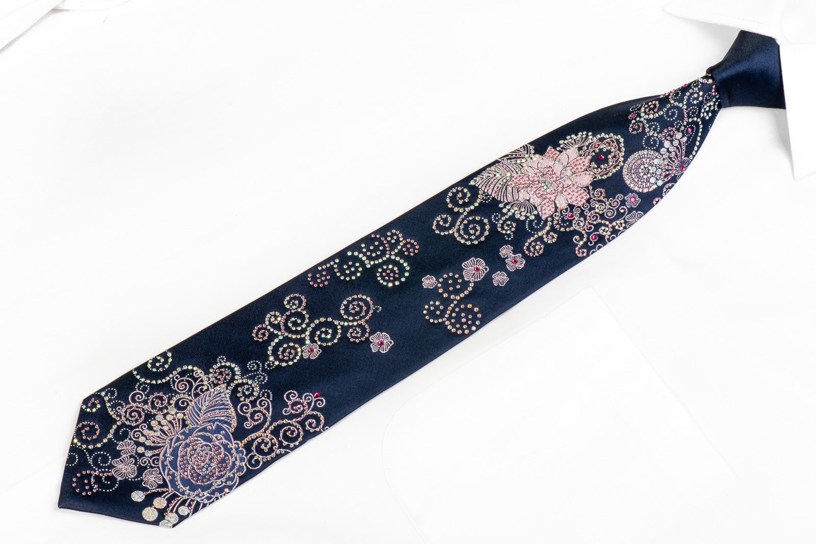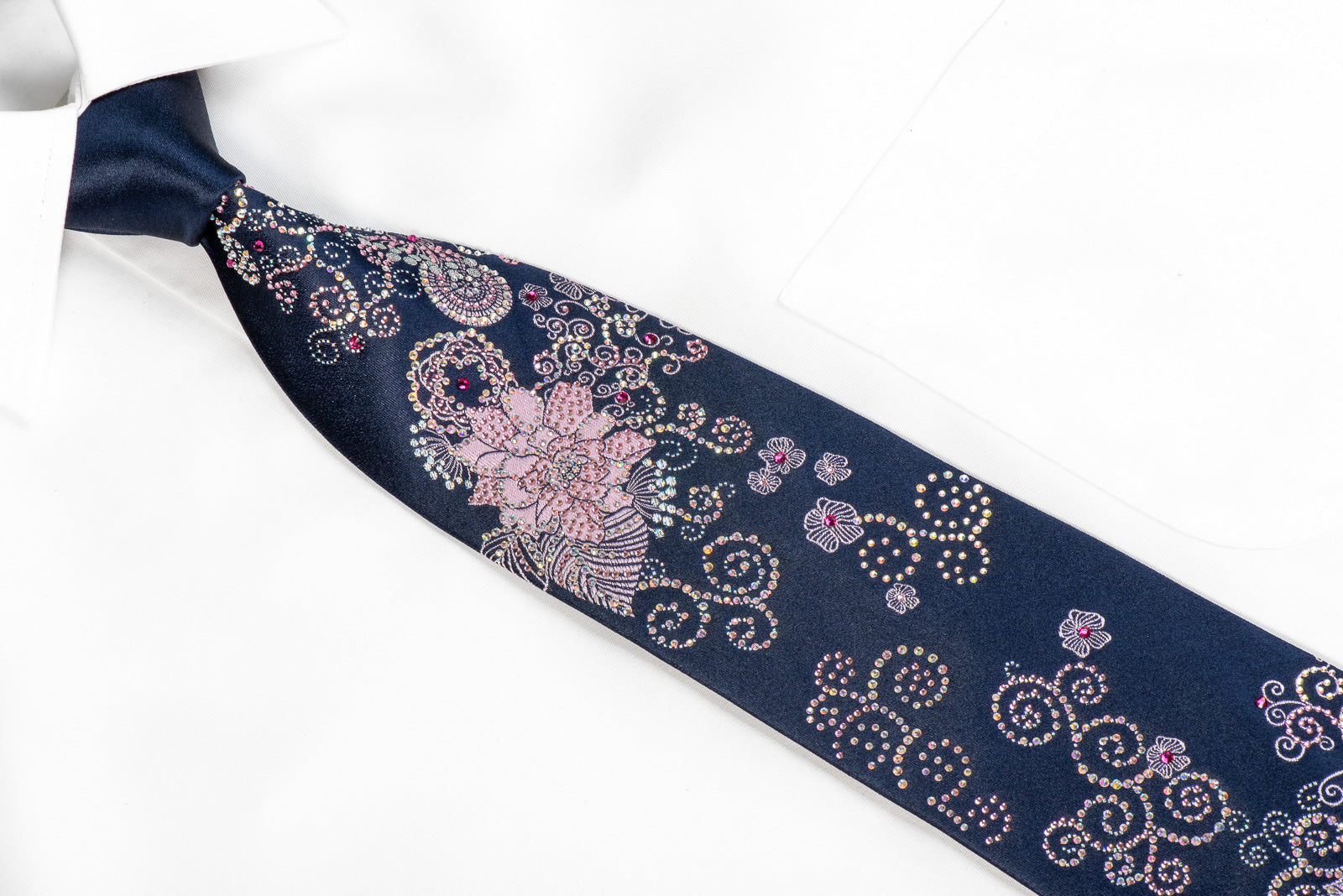 This is a beautiful Rhinestone necktie perfect for every occasion handmade from the finest quality silk and designed by top brand name Ungaro. Presenting an elegant woven pink Floral design on navy blue, sparkling with purple, crystal ab rhinestones and embellished with metallic silver sparkles.
