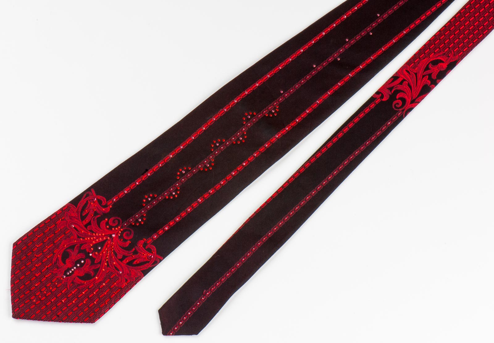 Material - SilkDesign - DamaskColor - BurgundyLength - Classic (57 in.-60 in.)(145 cm-153 cm)Width - Classic (3 1/4 in.-3 3/4 in.)(8 cm-9.5 cm)Special Features - Red Rhinestones, Silver Sparkles