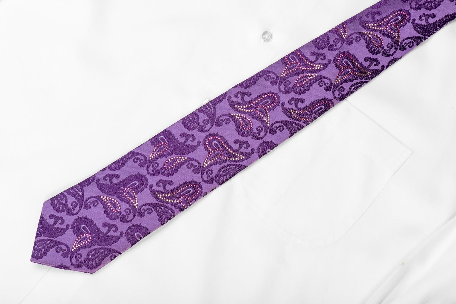 Experience luxury with Yezak's handmade and designer men's crystal silk tie featuring a stunning Paisley pattern on a regal purple background, adorned with sparkling crystal Rhinestones and silver sparkles.
